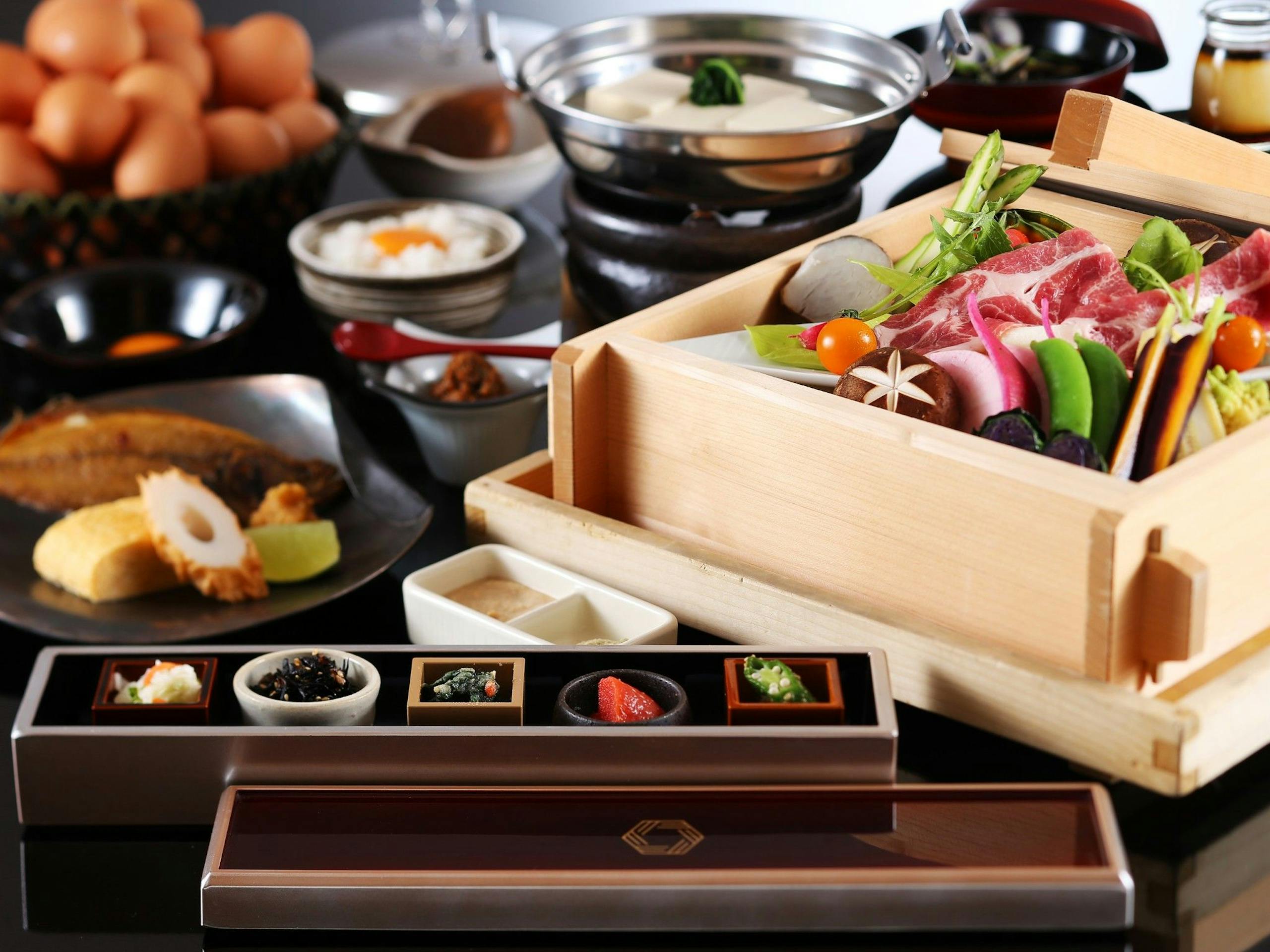 せいろ蒸しや但熊のこだわり卵、鳥取県東郷湖産しじみ味噌汁など、栄養満点、温かい朝食。