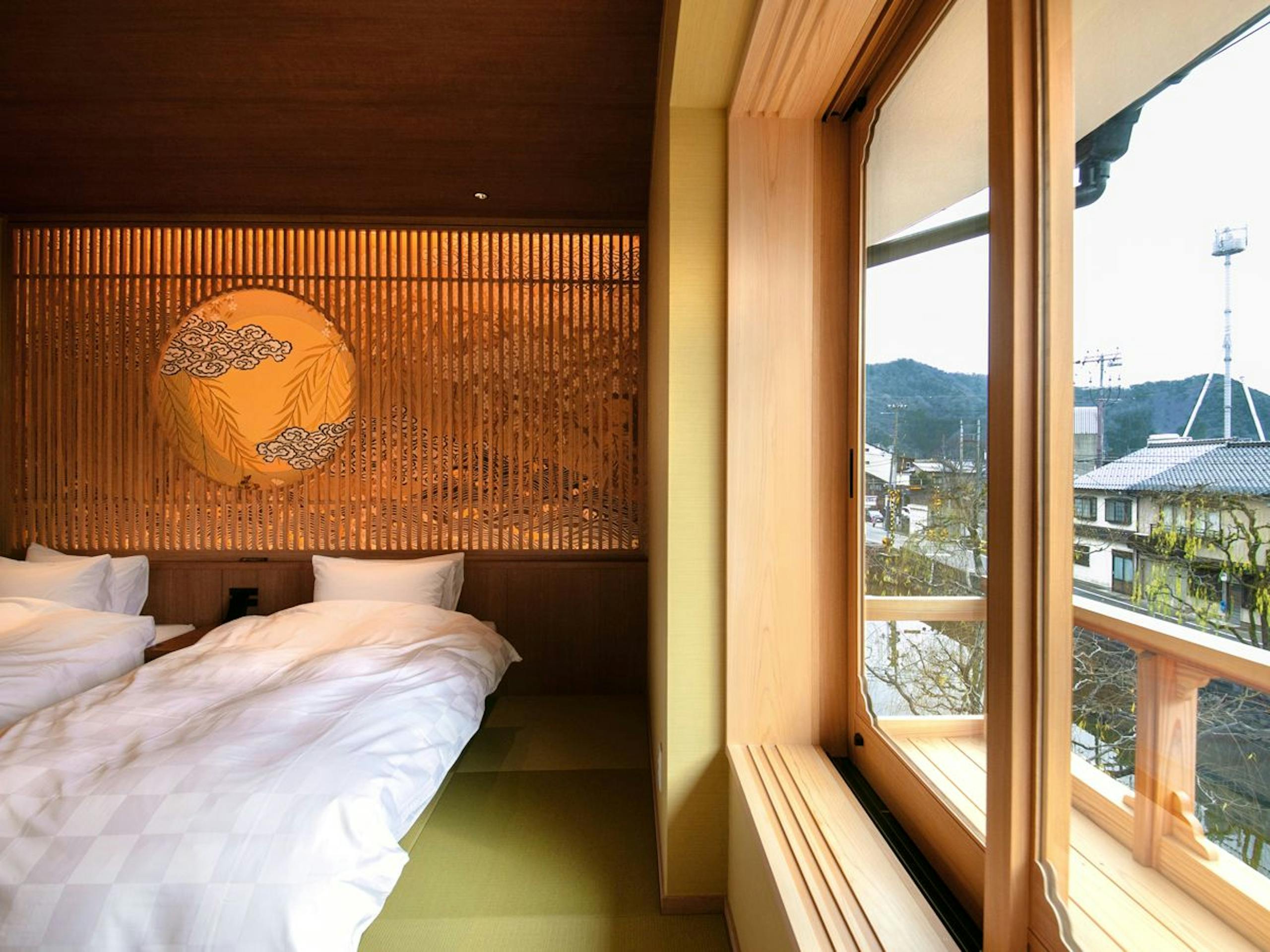 窓の外は城崎温泉の情緒豊かな街並みが広がっています。