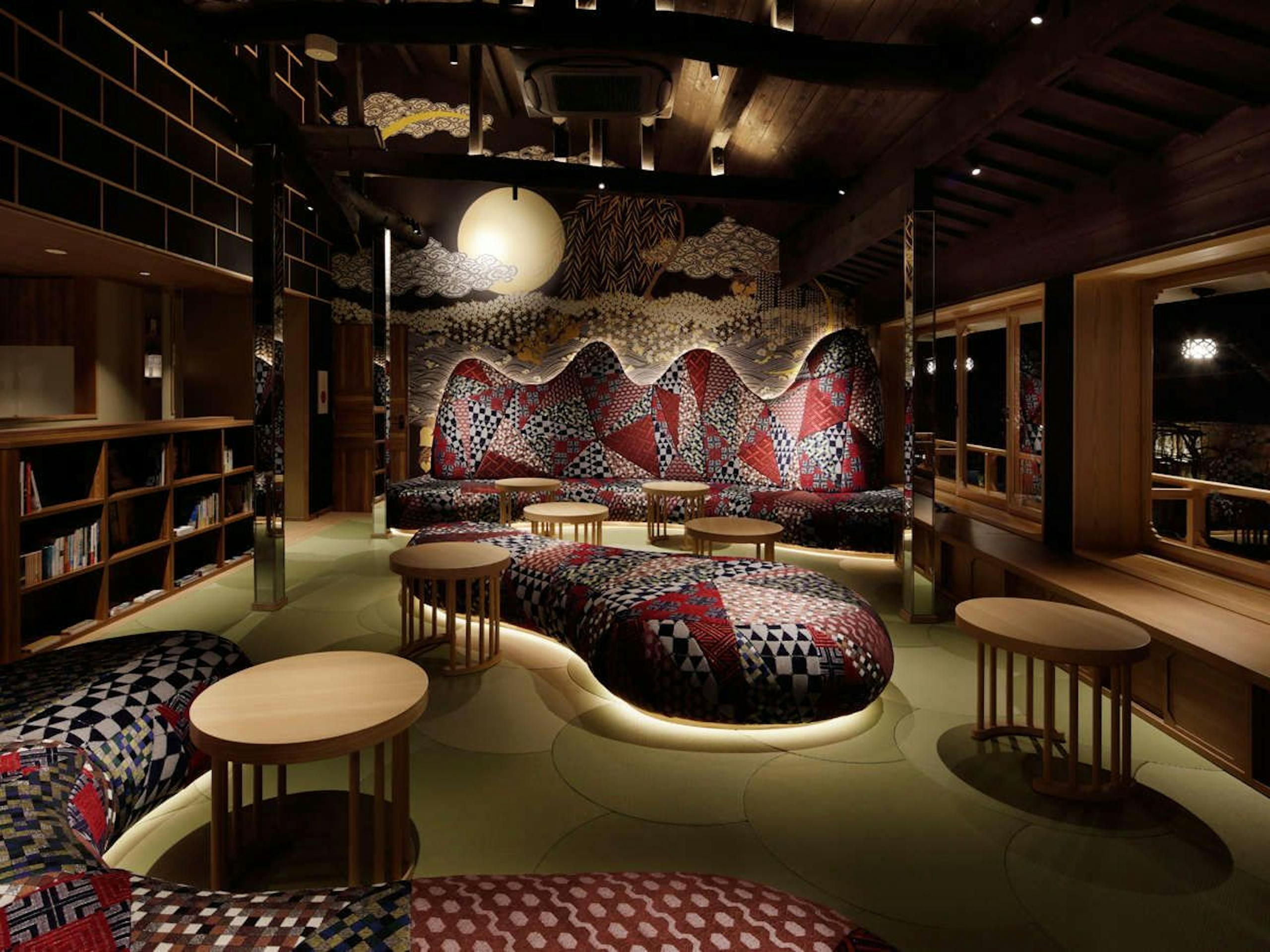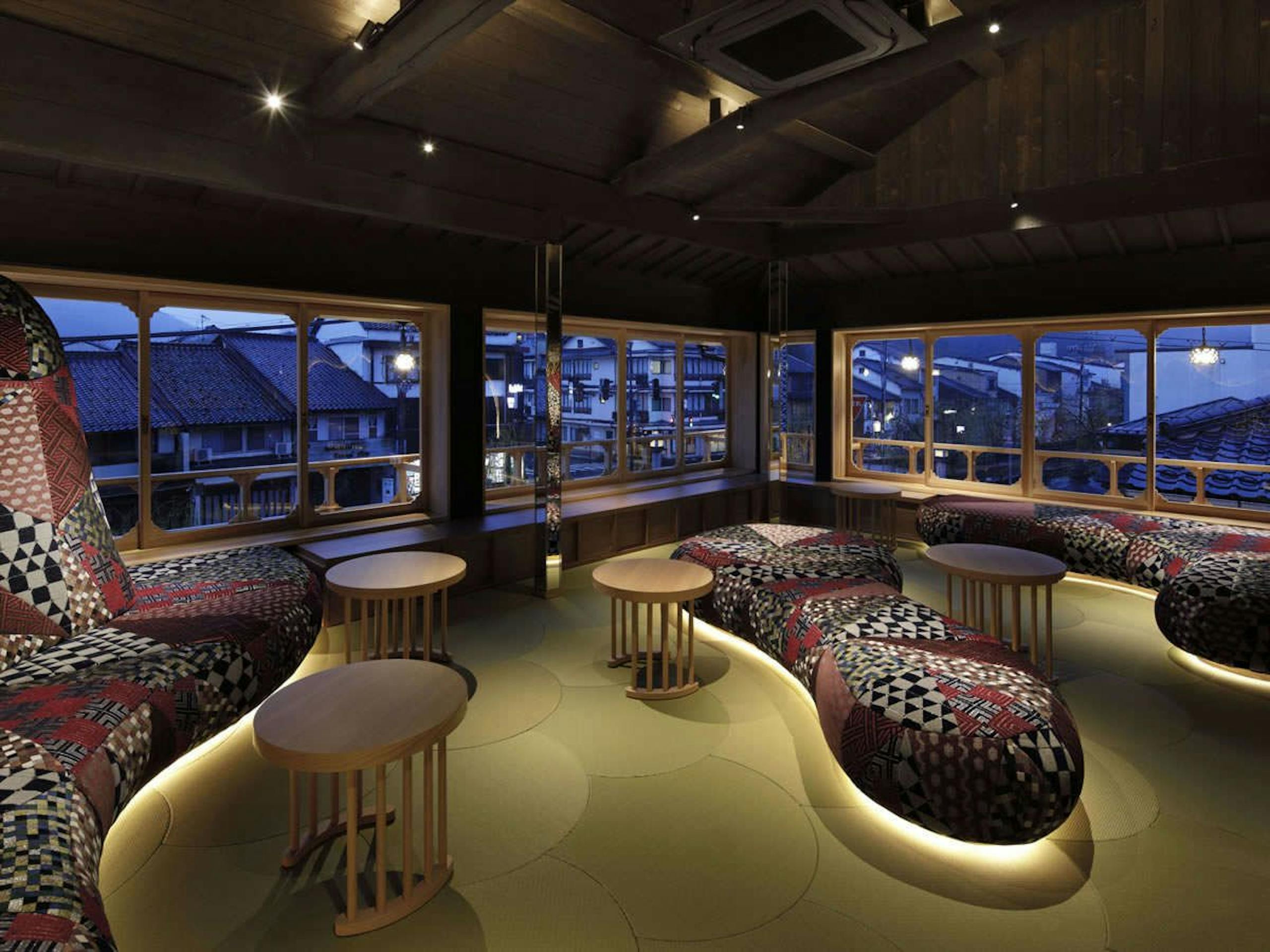 館内のラウンジや着物は有名デザイナーの斉藤 上太郎氏が手掛けた、斬新なデザイン。