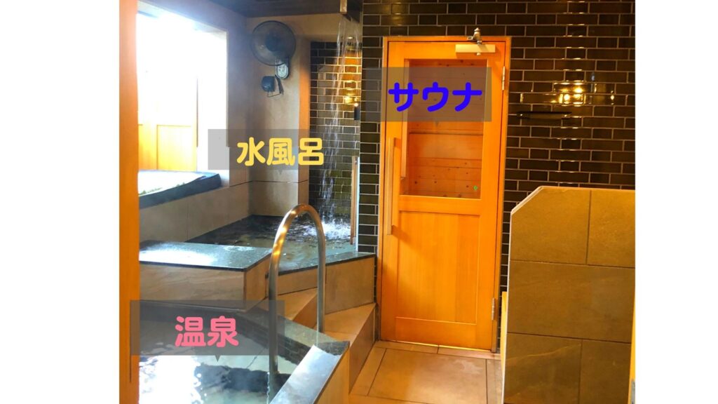 浴室は洗い場、温泉、水風呂、サウナ、ソファースペースがあります。
