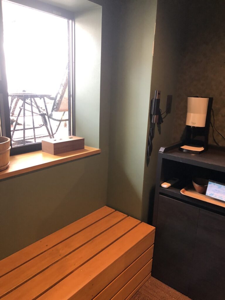 ソファースペースの横からテラスへ出れます。水風呂からのチェアに座って外気浴…。澄んだ冷たい空気が、肺にすぅーっと入って清められた気分になります。