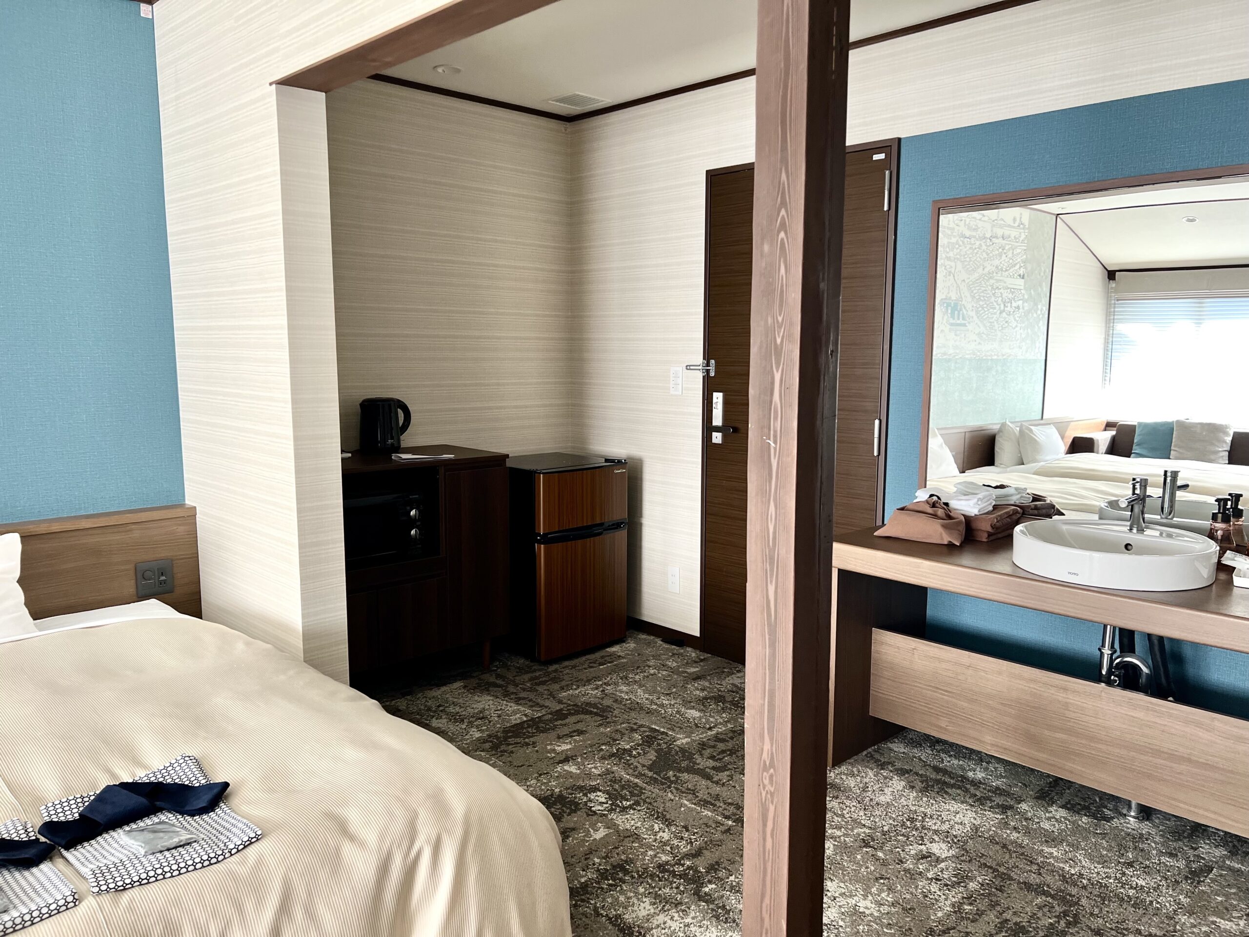 くすみがかかった青とこげ茶色が印象的な爽やかさのある客室。今回泊まったのは「和モダンツイン」のお部屋。