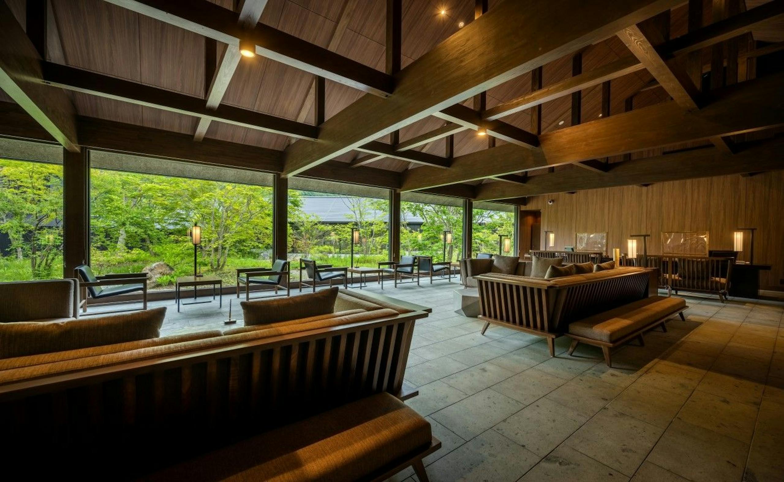 緑豊かな庭園が見えるロビーラウンジで、チェックインや食後を過ごすのも悪くありません。