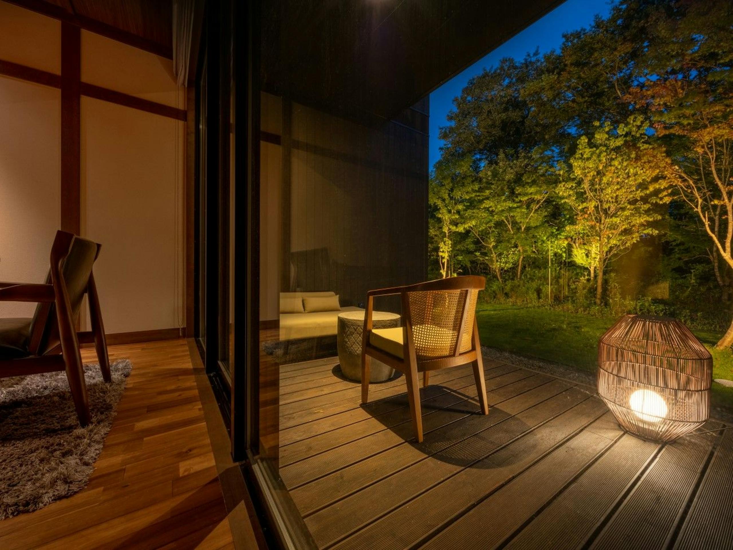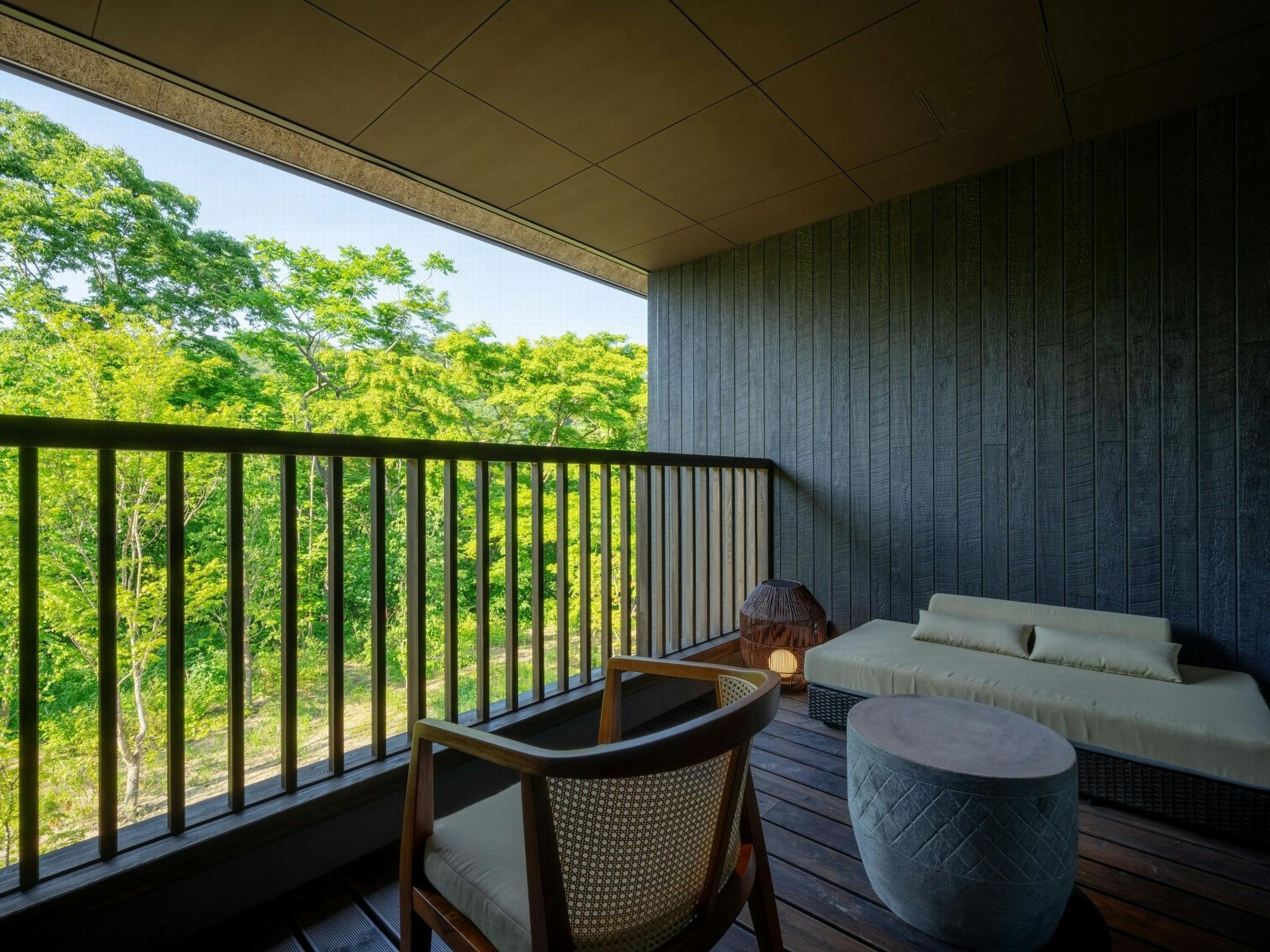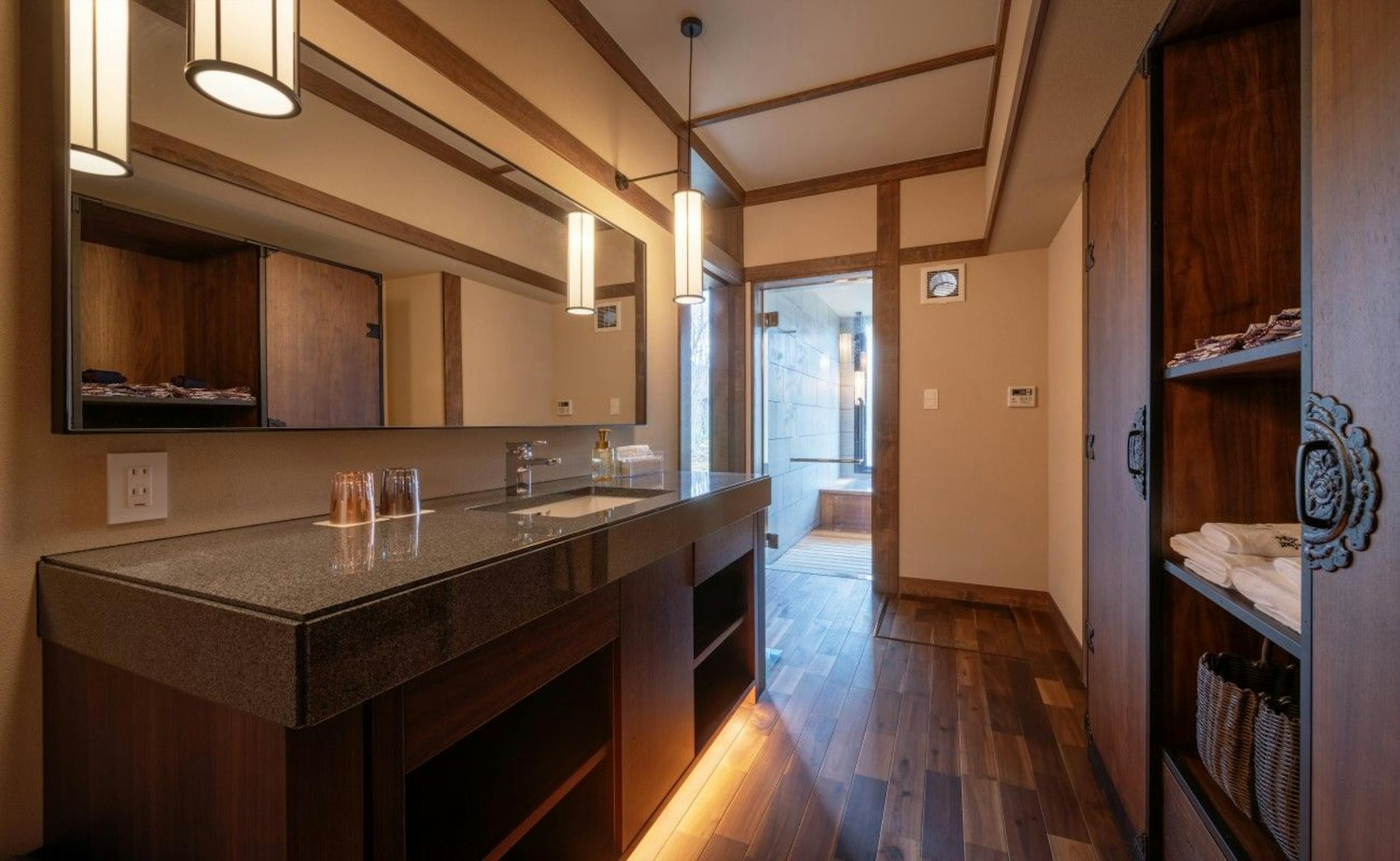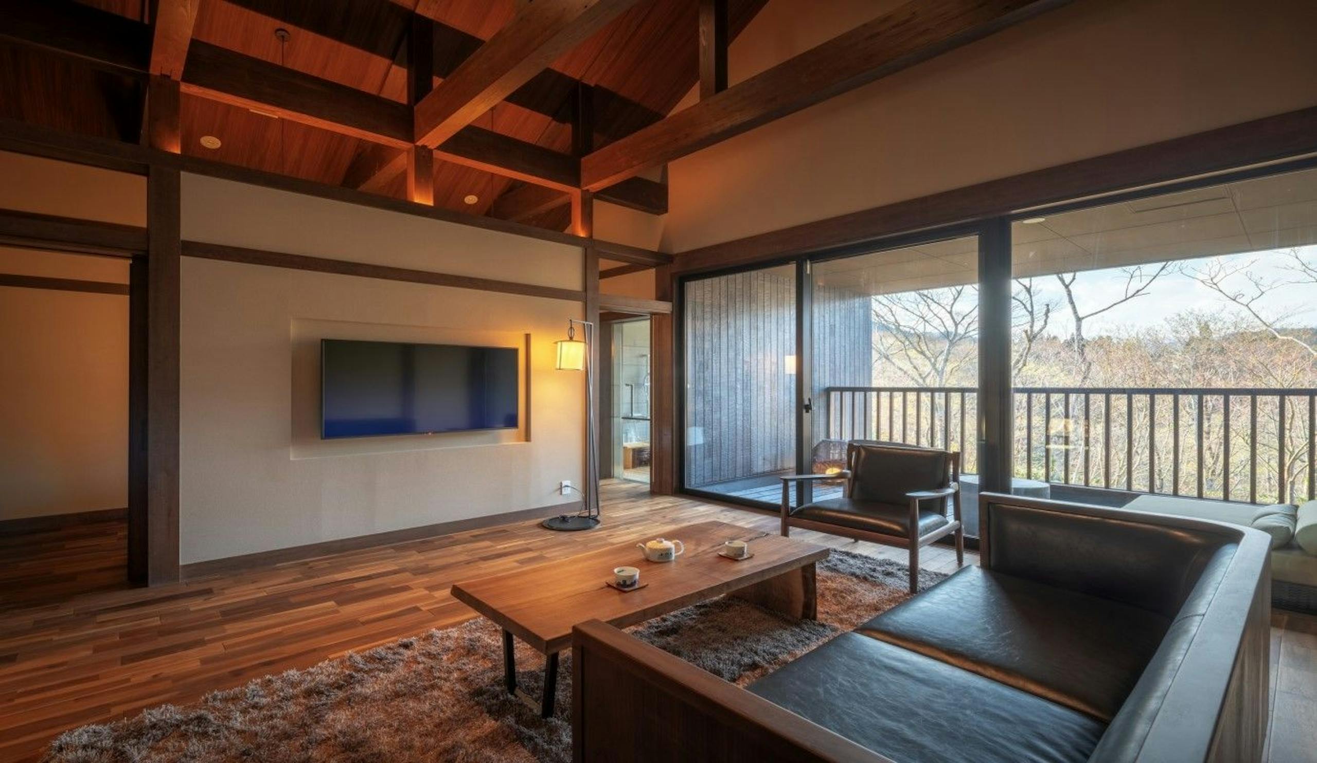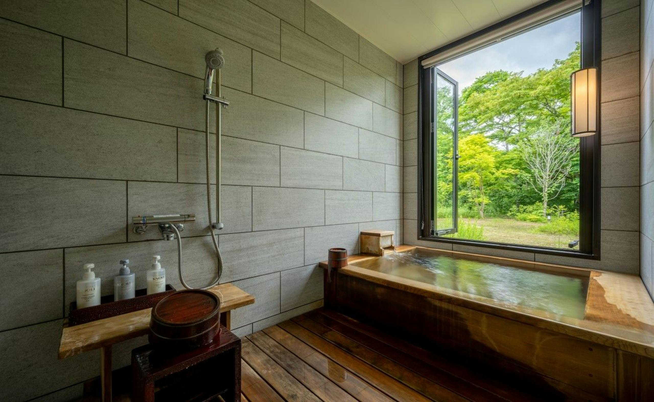 全客室、源泉かけ流しの浴槽付という贅沢なしつらえ。