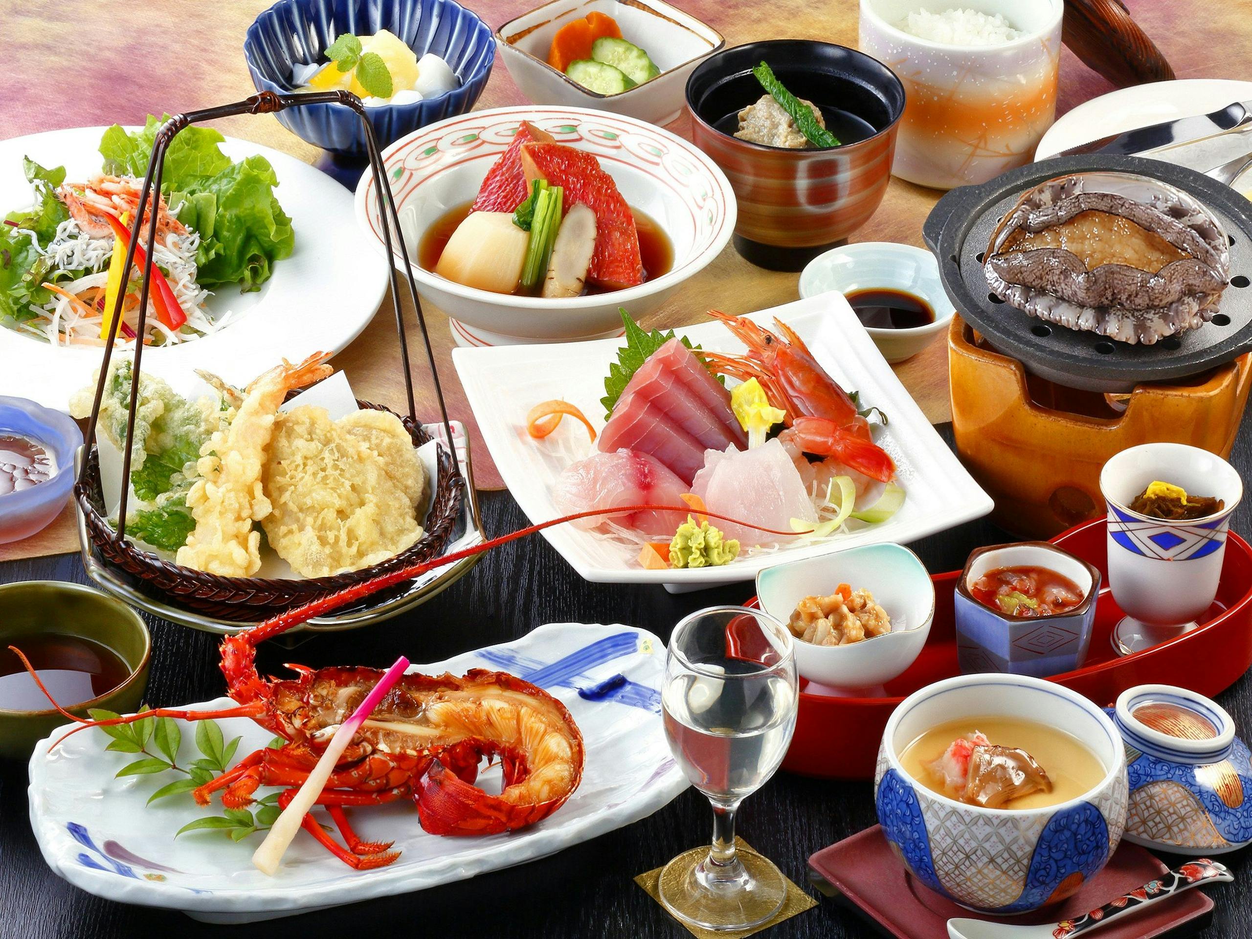 会席料理の他に、別注料理では伊勢海老姿造りや金目鯛の煮付けなど、高級な魚介類をいただけます♩