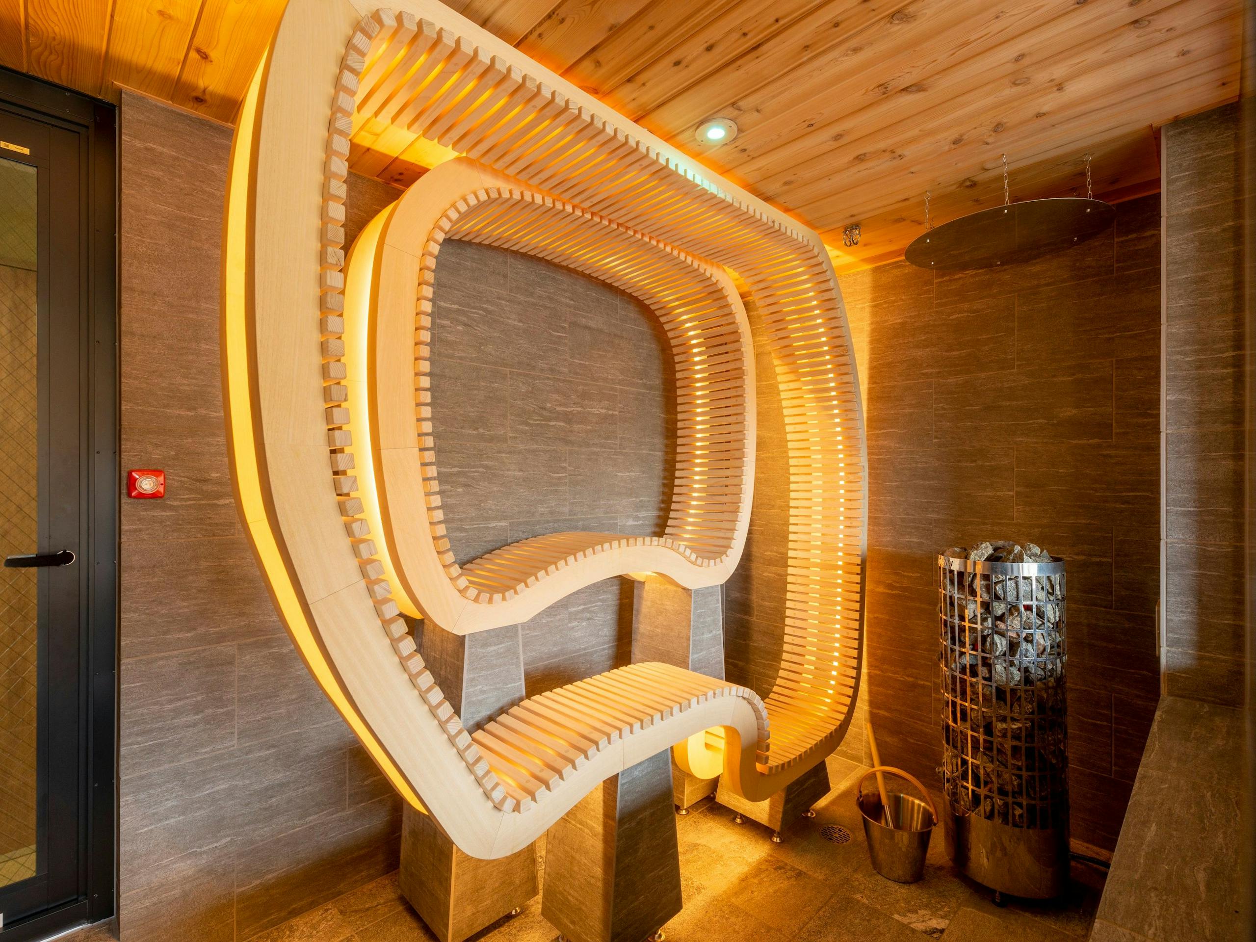 ”人の身体にフィットするように設計された2段の曲線ベンチ”とのことで、くつろぎながらサウナを存分に楽しめる仕様となっています。