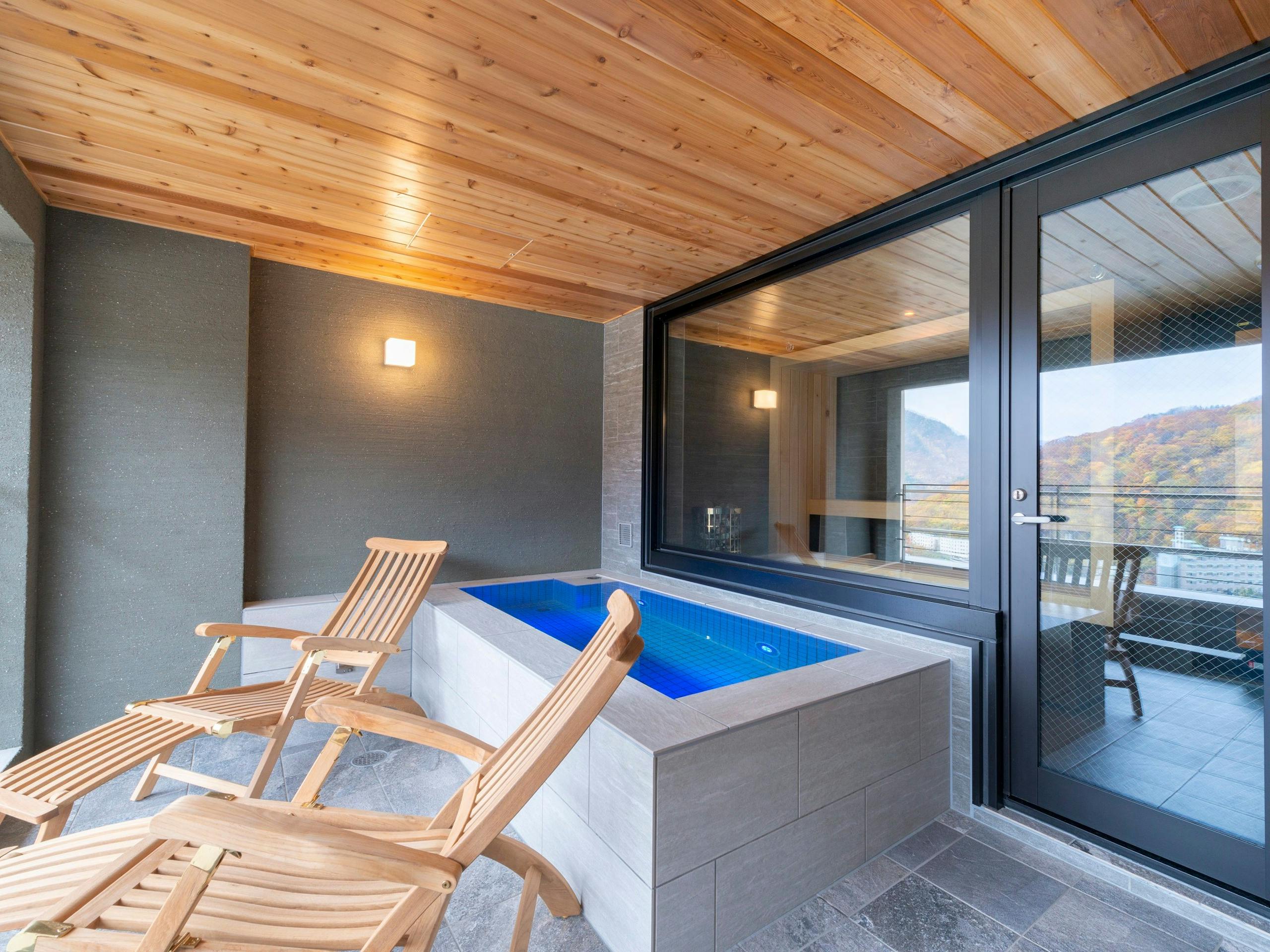 テラスには水風呂とデッキチェア。