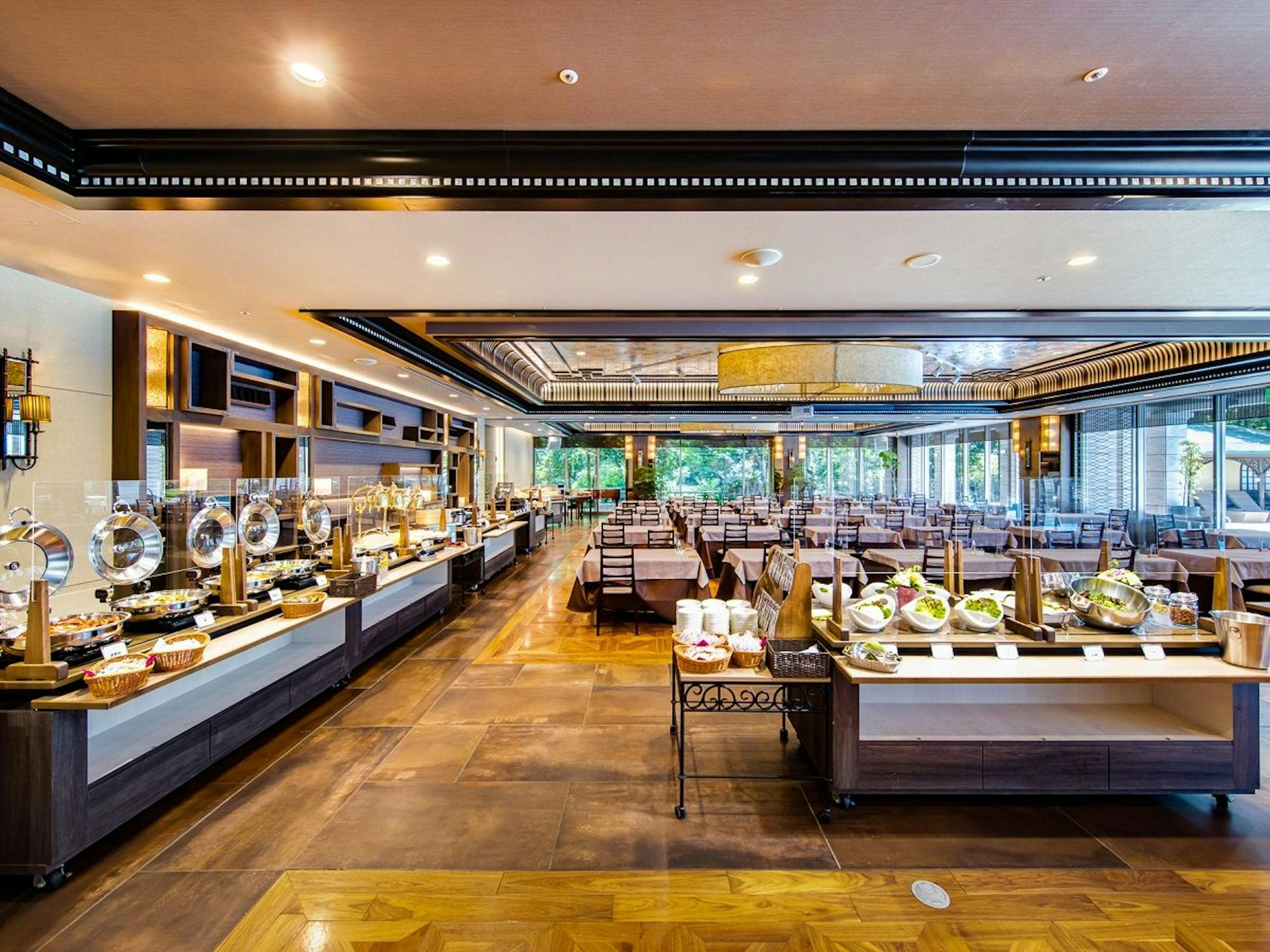 朝食バイキングでは、和洋折衷、様々な料理が楽しめます。