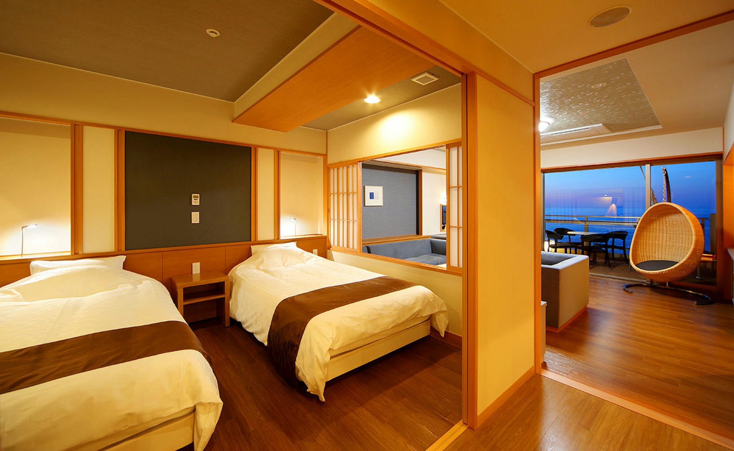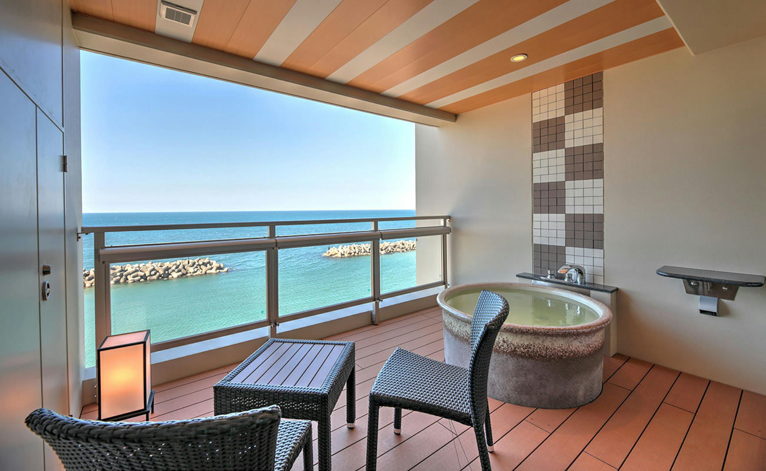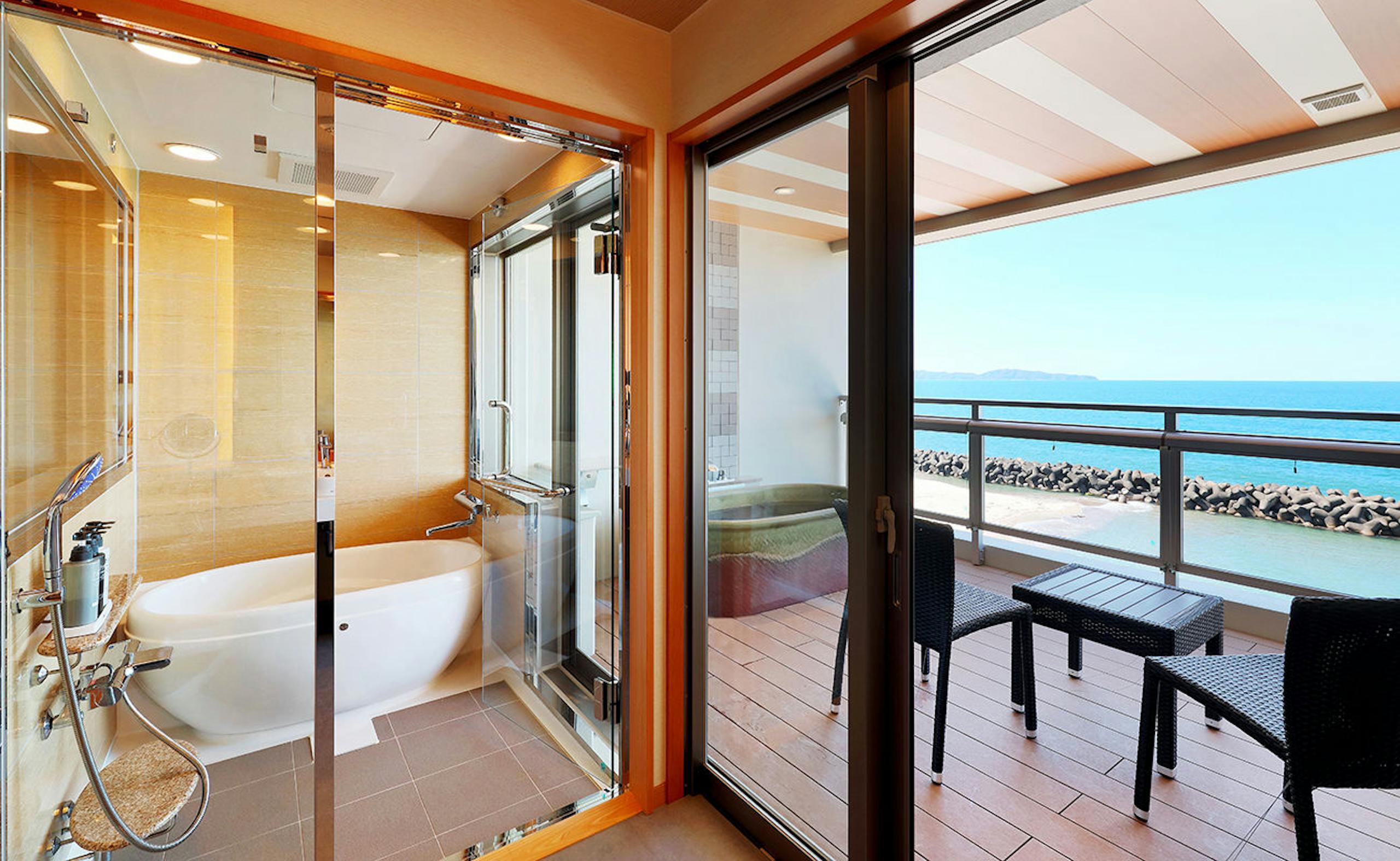 海と湯舟が繋がったかのような、美しいインフィニティ露天風呂。