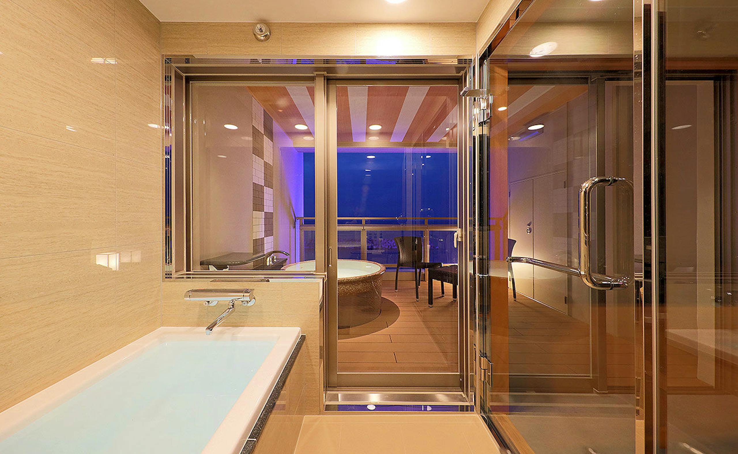 天気の良い日はテラスの露天風呂、寒い日は室内のお風呂、と室内外にお風呂が付いているので使い分けができます。