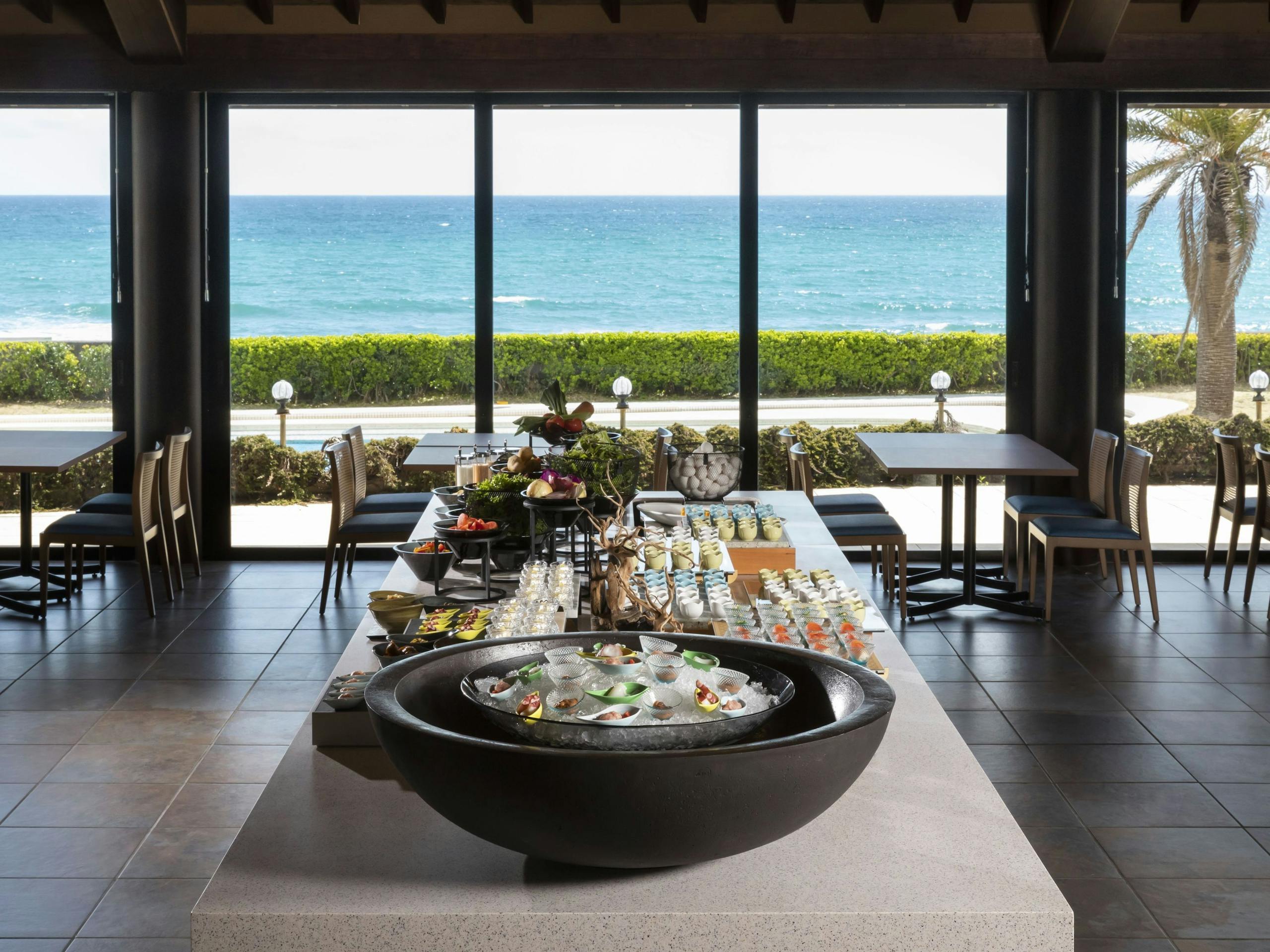 ディナービュッフェの場合、写真のオーシャンフロントのレストランでいただきます♩