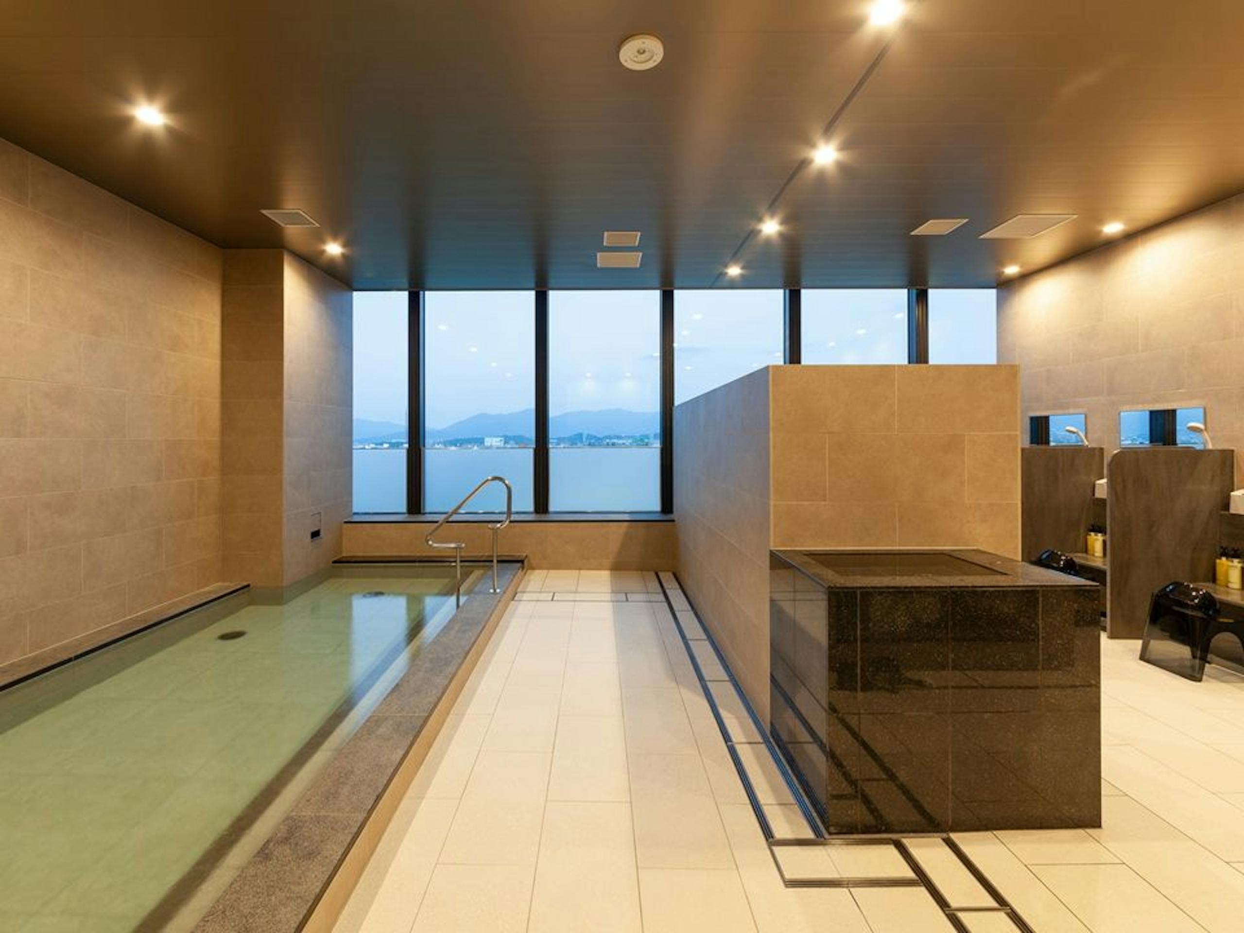 最上階、ガラス張りの内湯からは福岡空港方面の景色を見ることもできます。