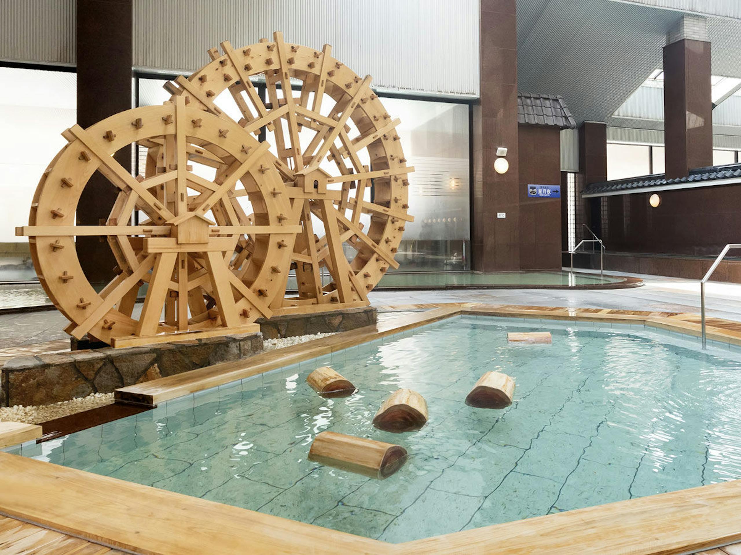 水車がある斬新な温泉は、いつもと違った雰囲気のバスタイム♩