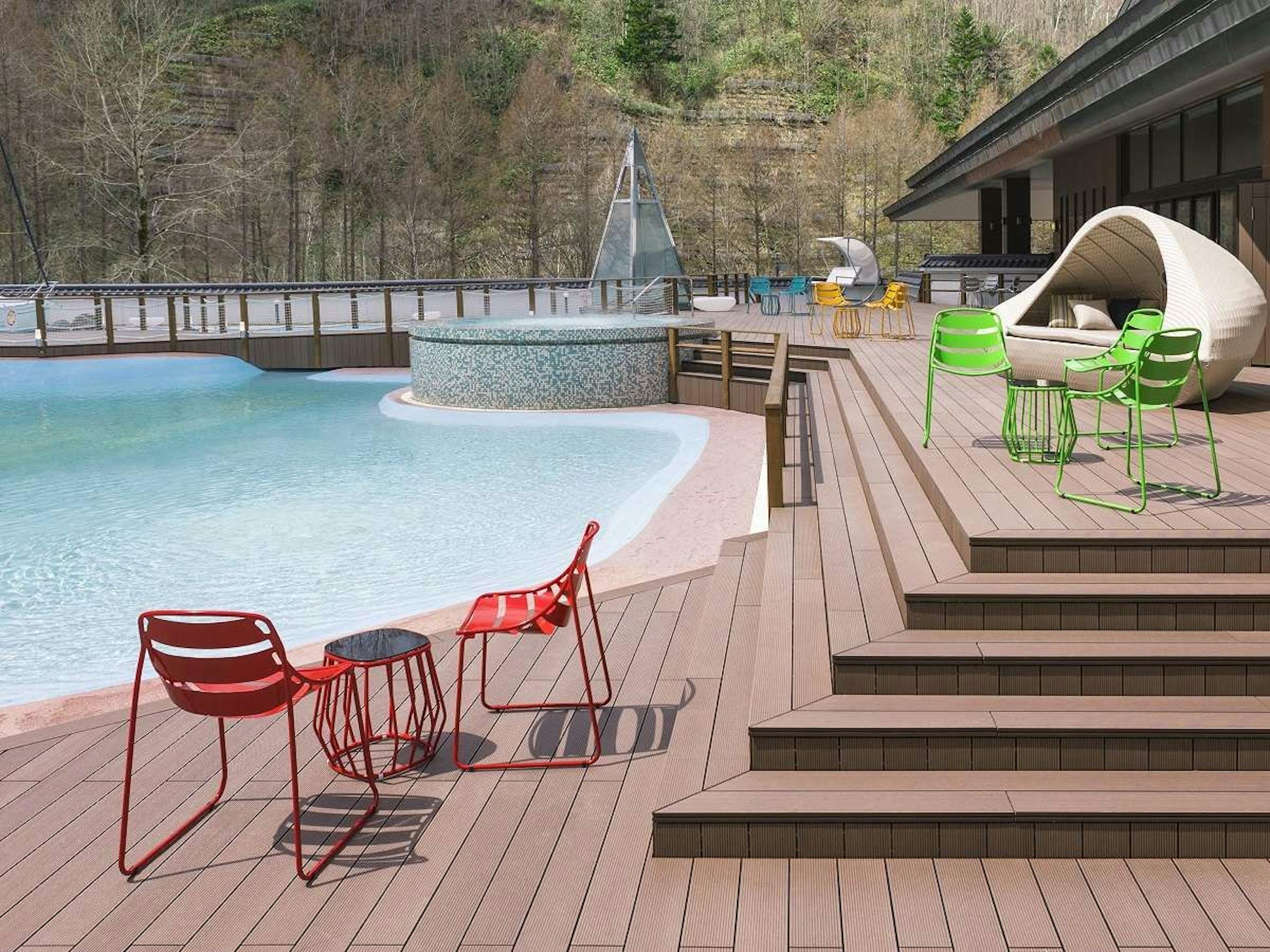 湯温約36℃なので、1年中利用可能◎ ジャグジーに浸かるのも良し、ソファにて自然を感じながら日光浴するも良し、泳がなくてもOK!