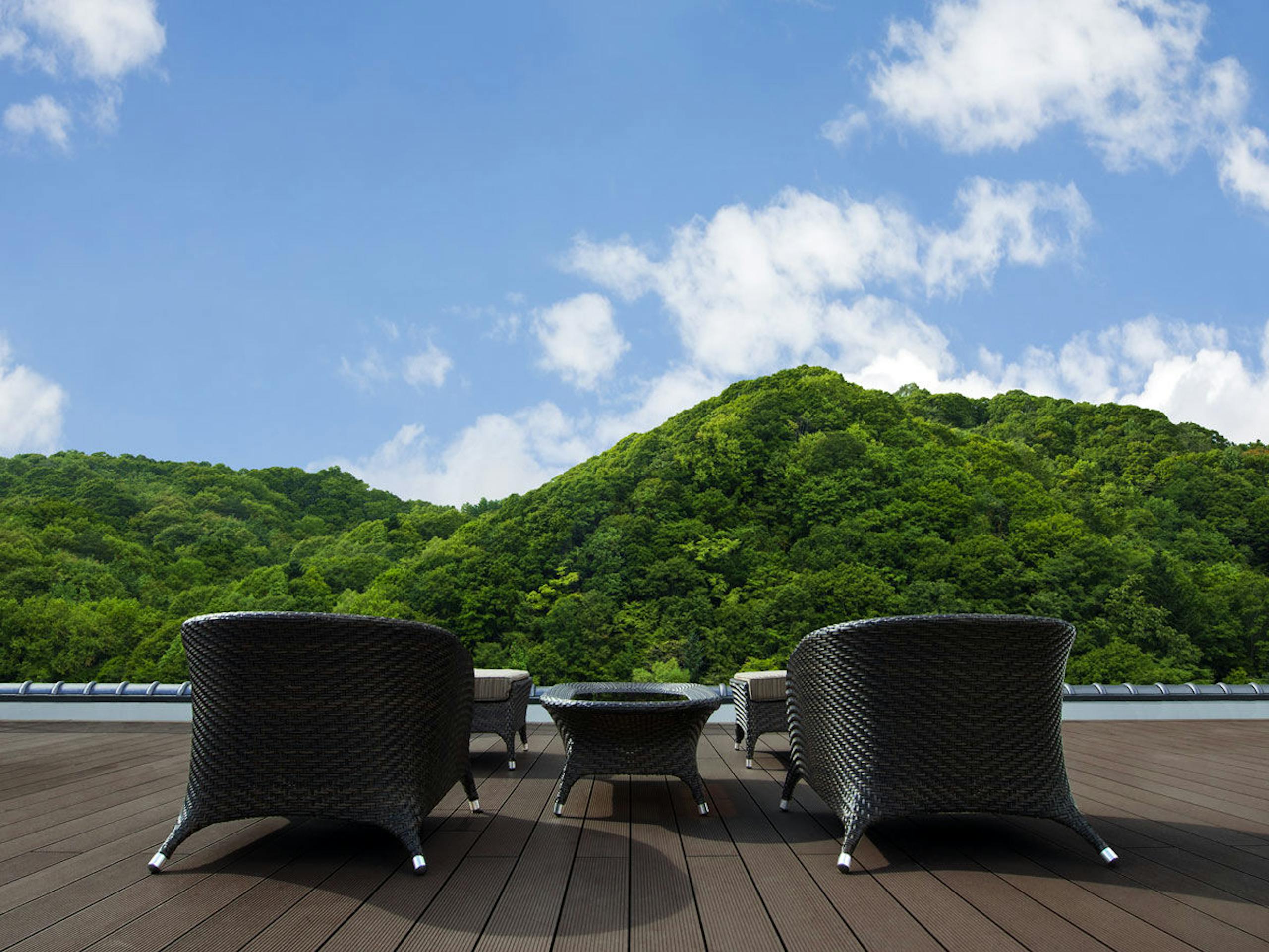 屋上の空中庭園「流星ラウンジ」は、昼間は雄大な山々の景色を楽しみ、