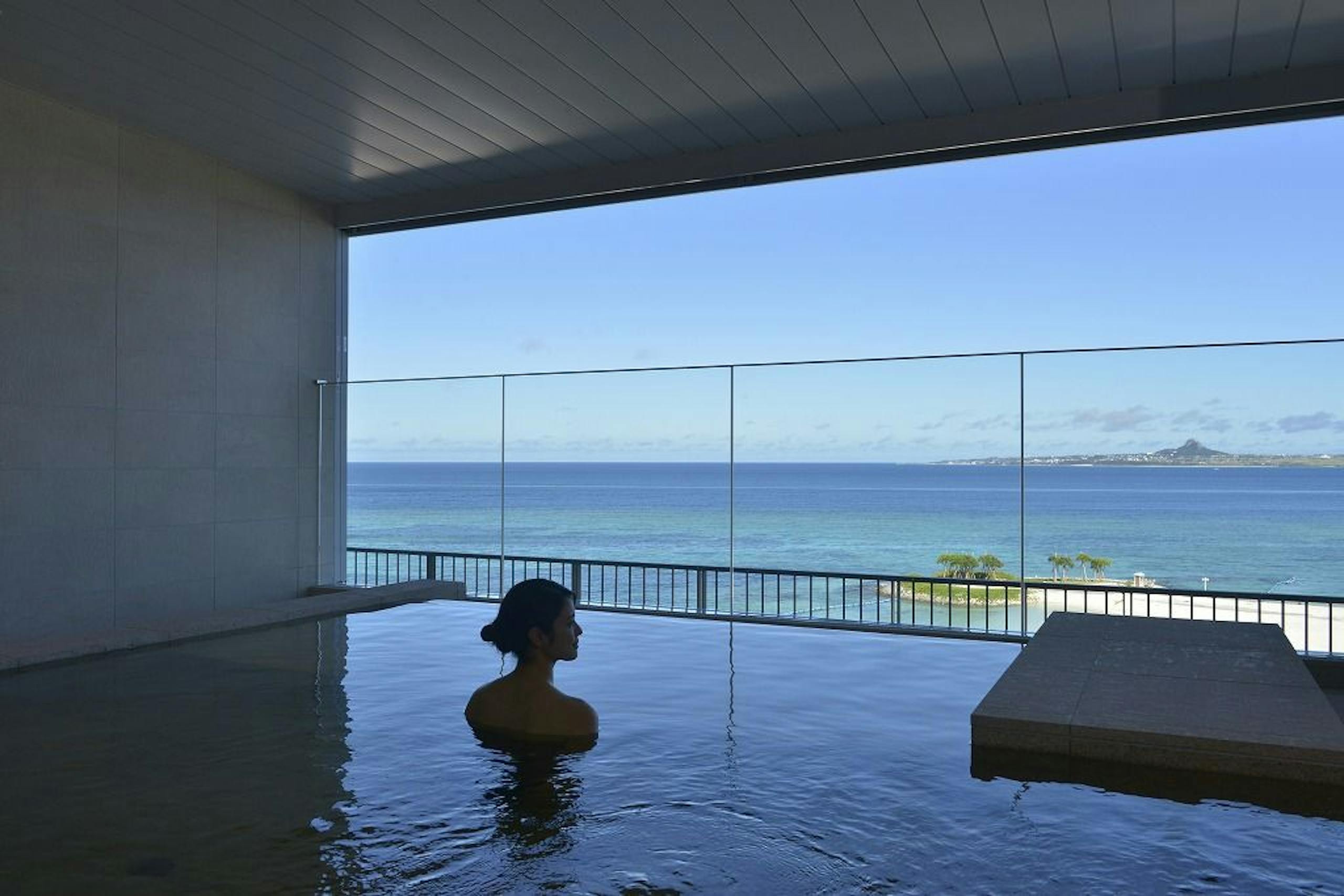 エメラルドビーチと、インフィニティ―プールに、開放的な温泉は訪れる人を非日常へといざなってくれます。