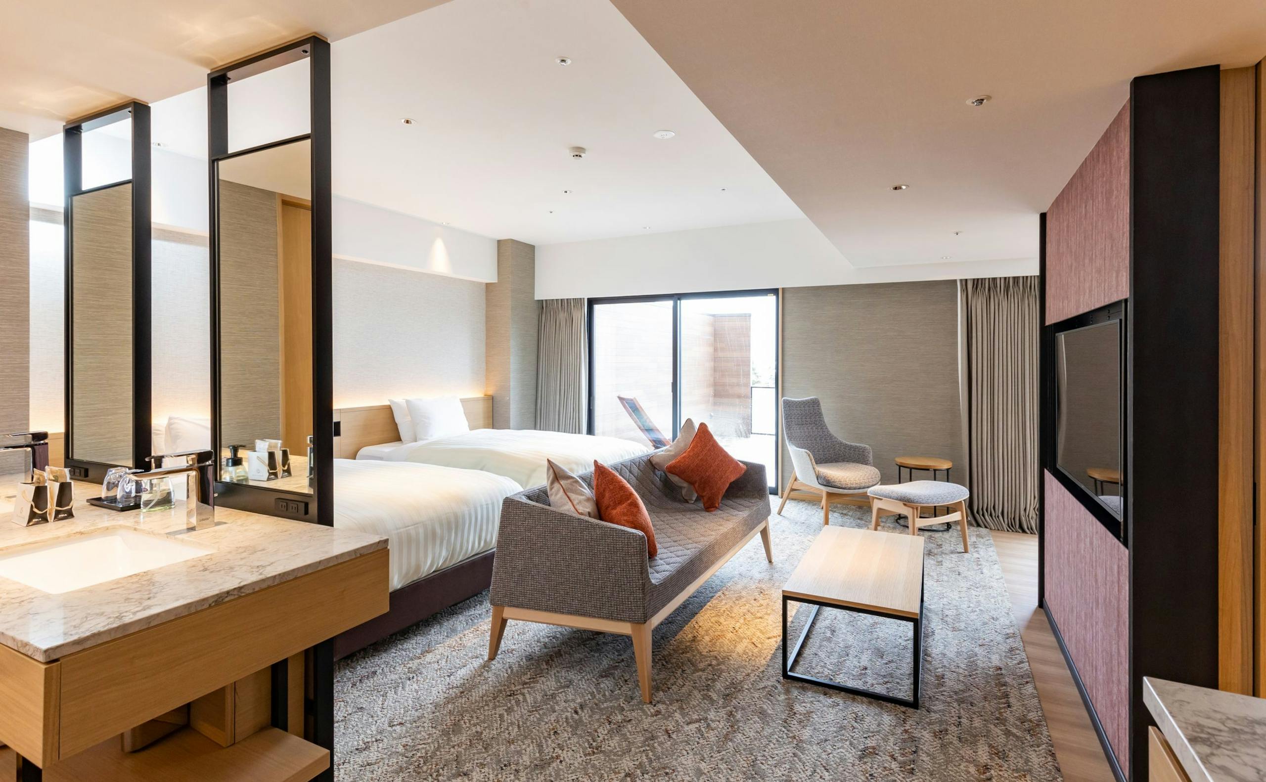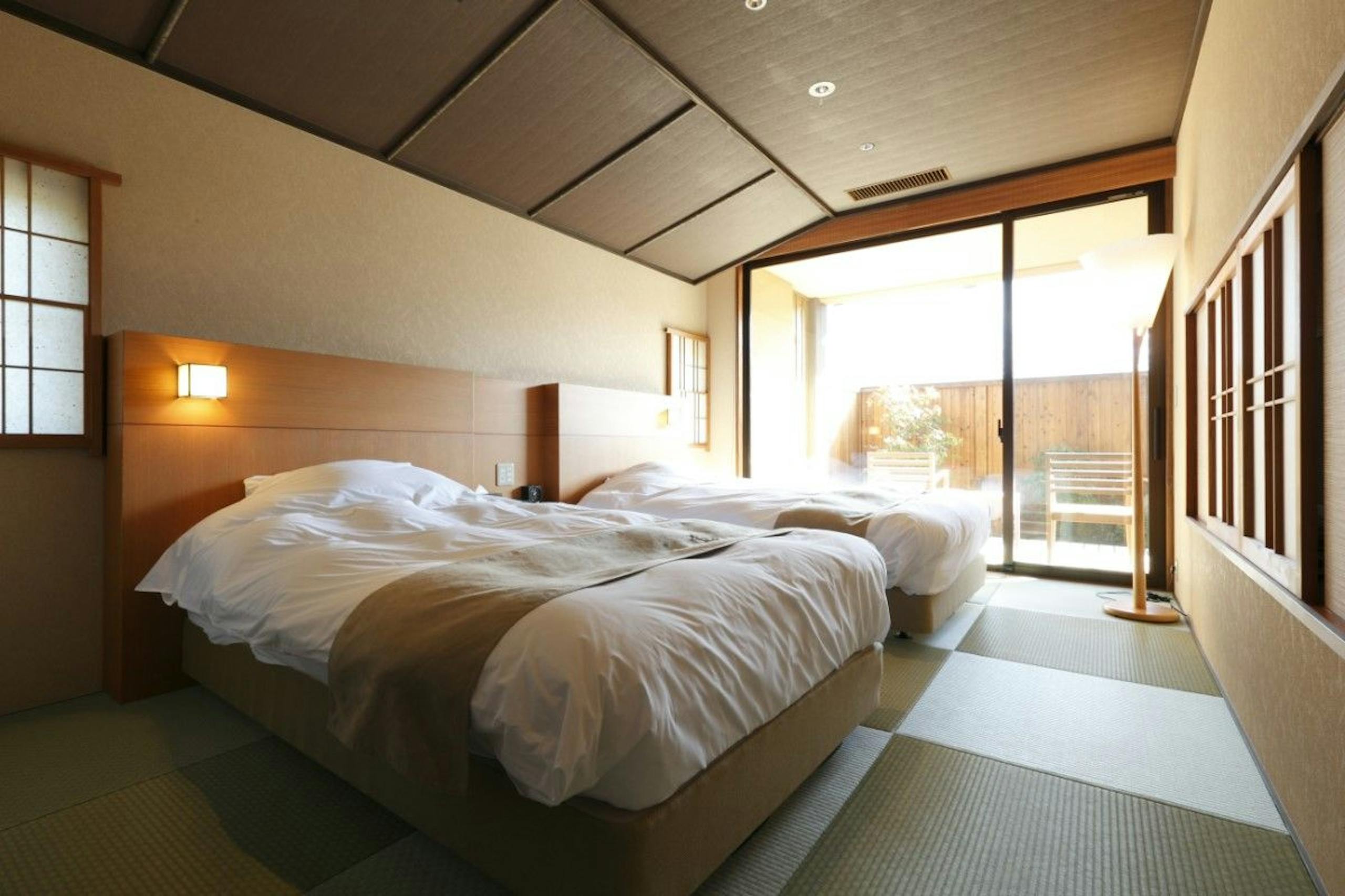 シンプルで心地の良い客室。半露天風呂付客室のご用意もあります。