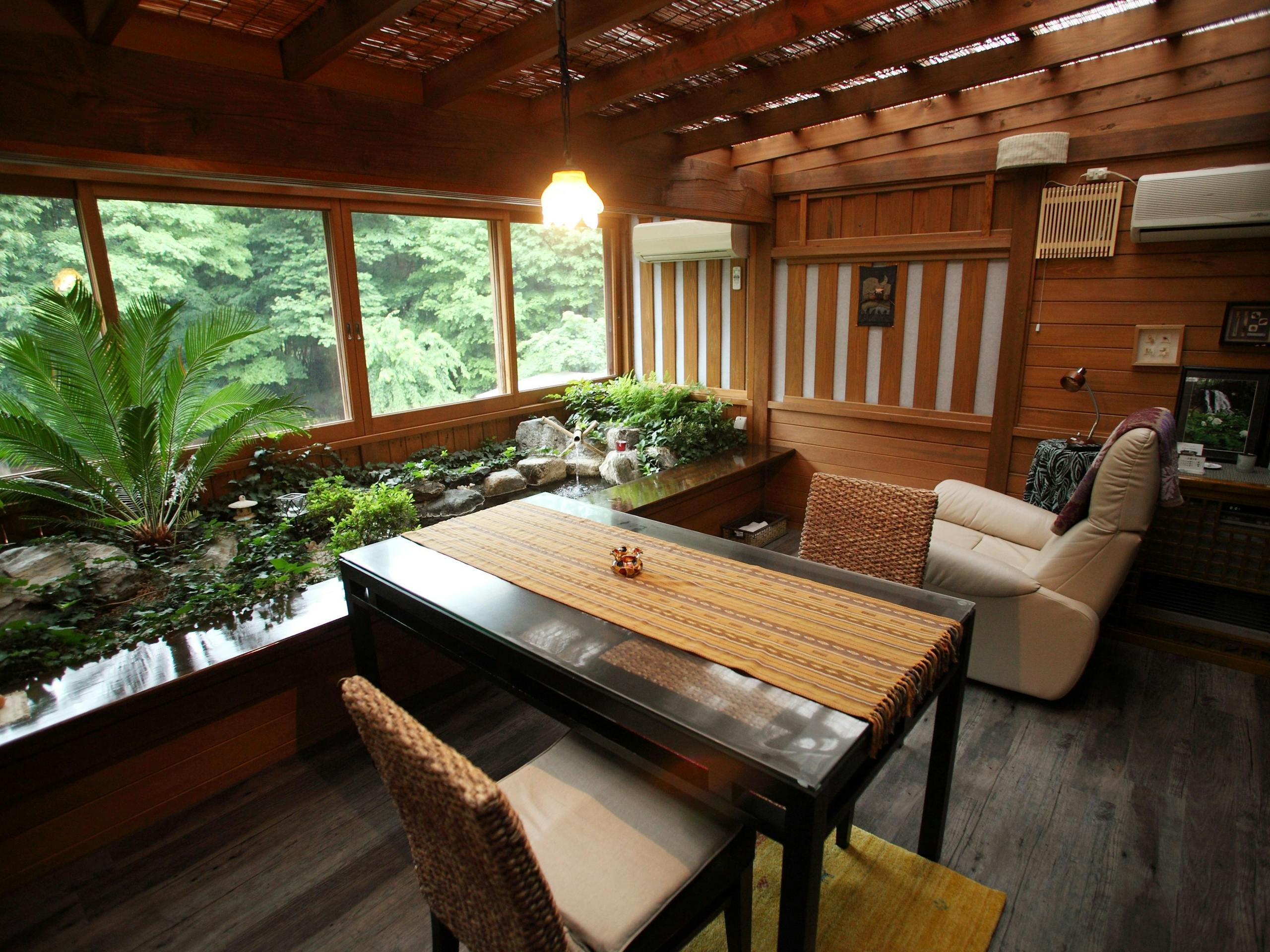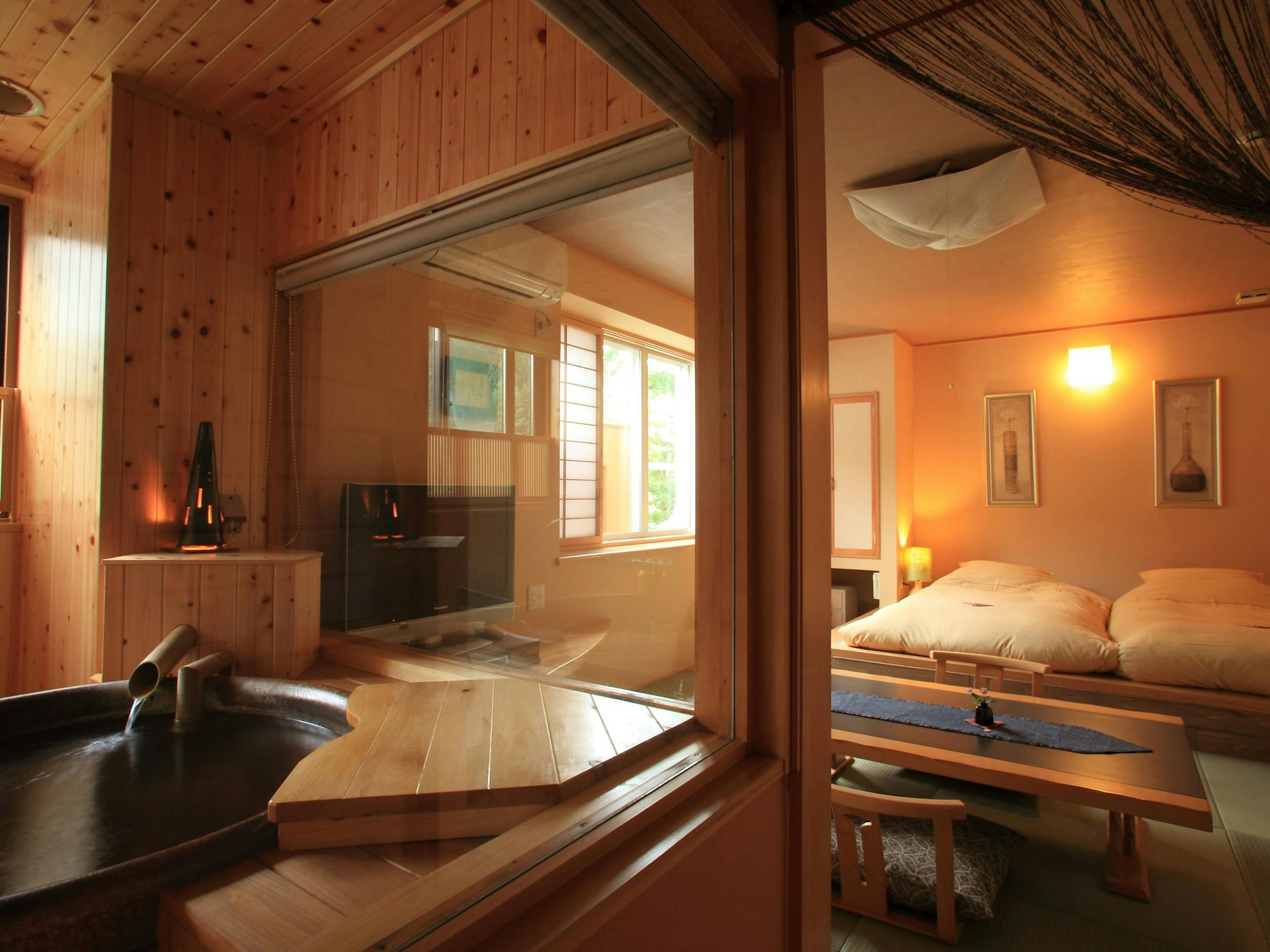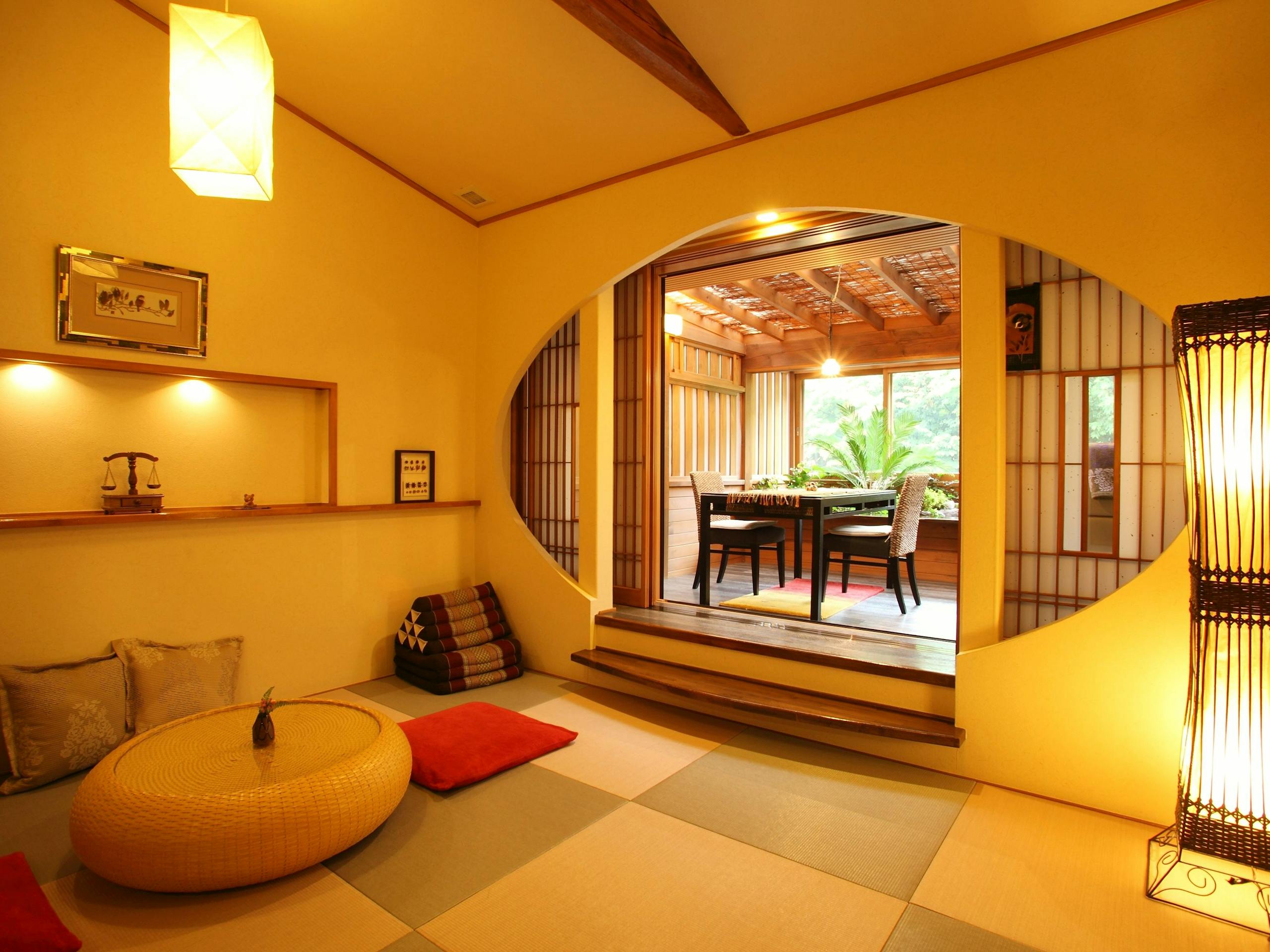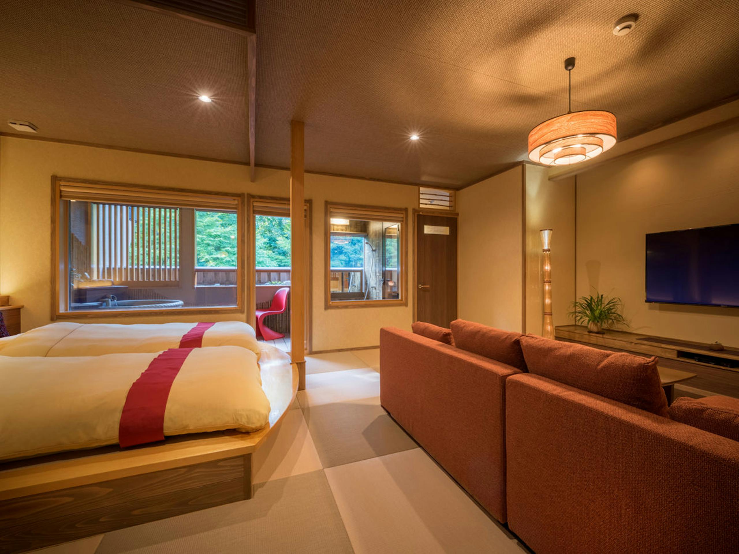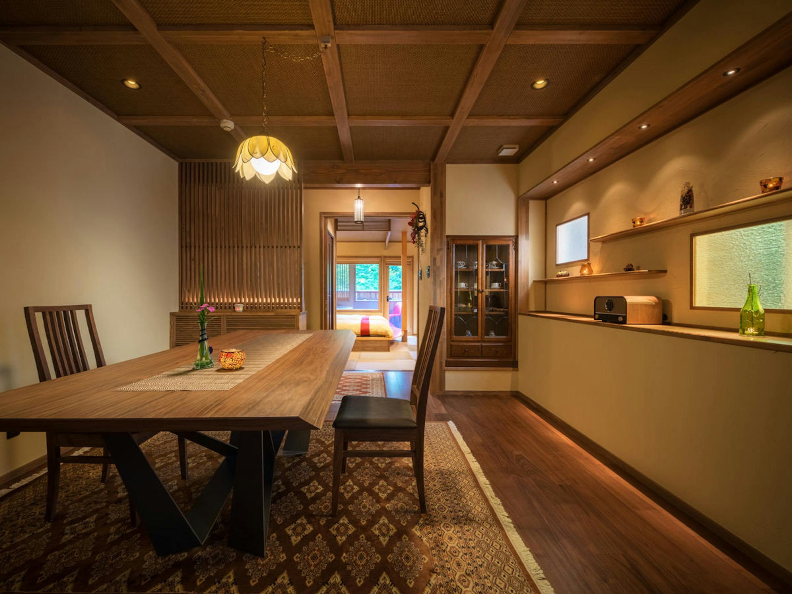 リビングルームに客室専用ダイニング、陶器の露天風呂を兼ね備えた、贅沢なしつらえ。