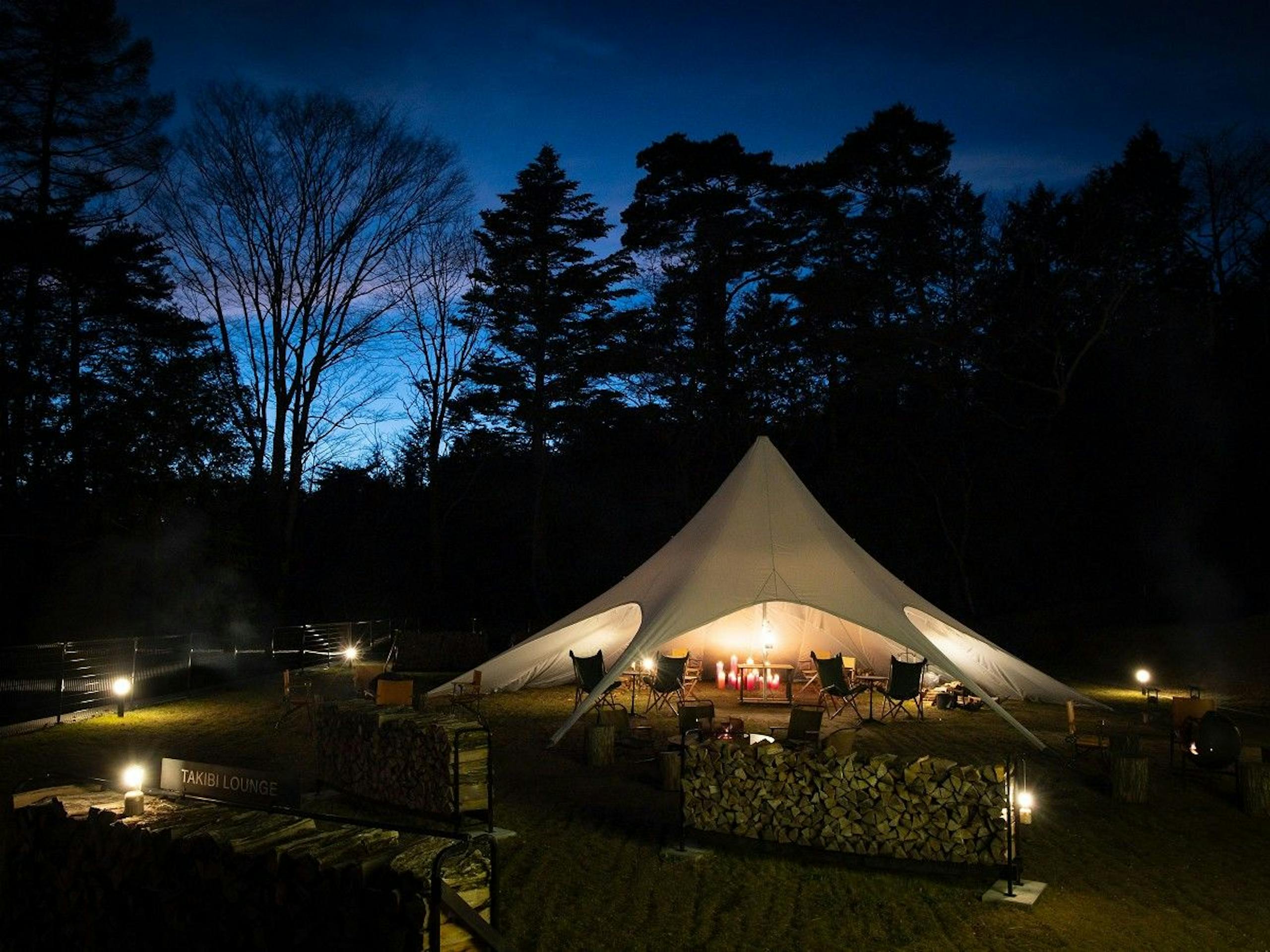 夕方になると焚火台に日が灯る焚火ラウンジ。