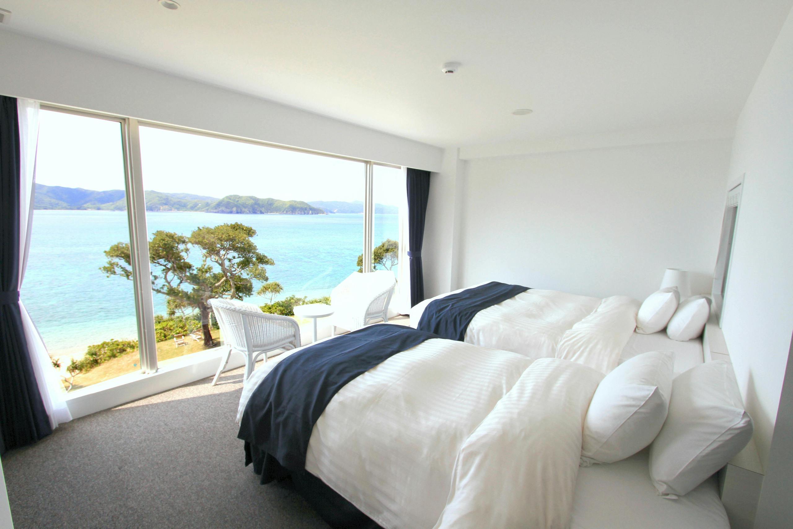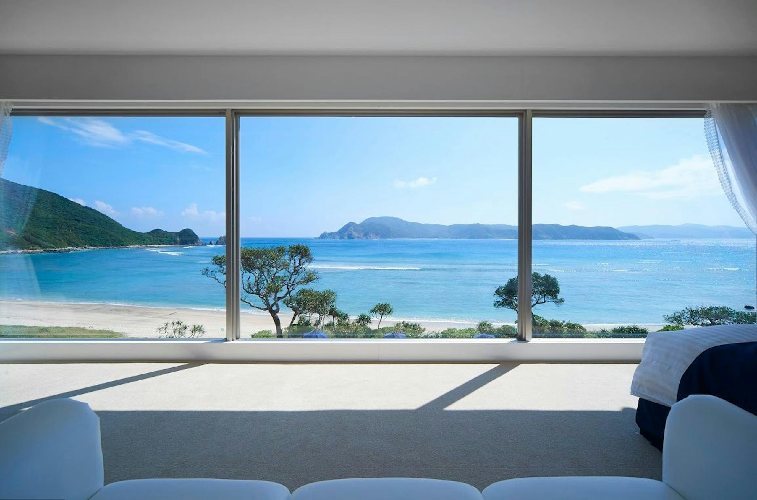 大きい窓からは、奄美大島の綺麗な海が見渡せます。