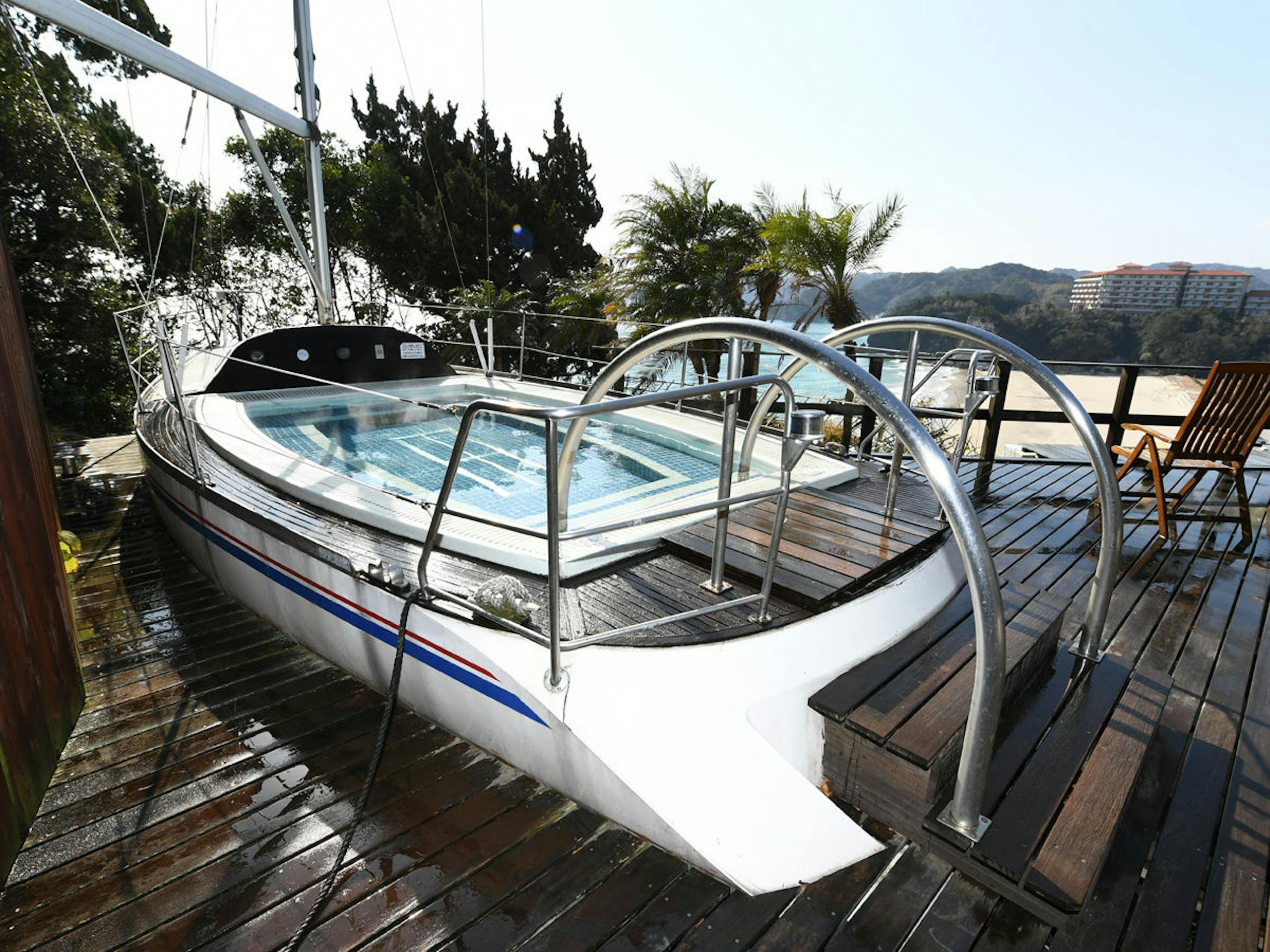 洋風大浴場にある「マーメイド」は、本物のヨットを改造してつくられた露天風呂。