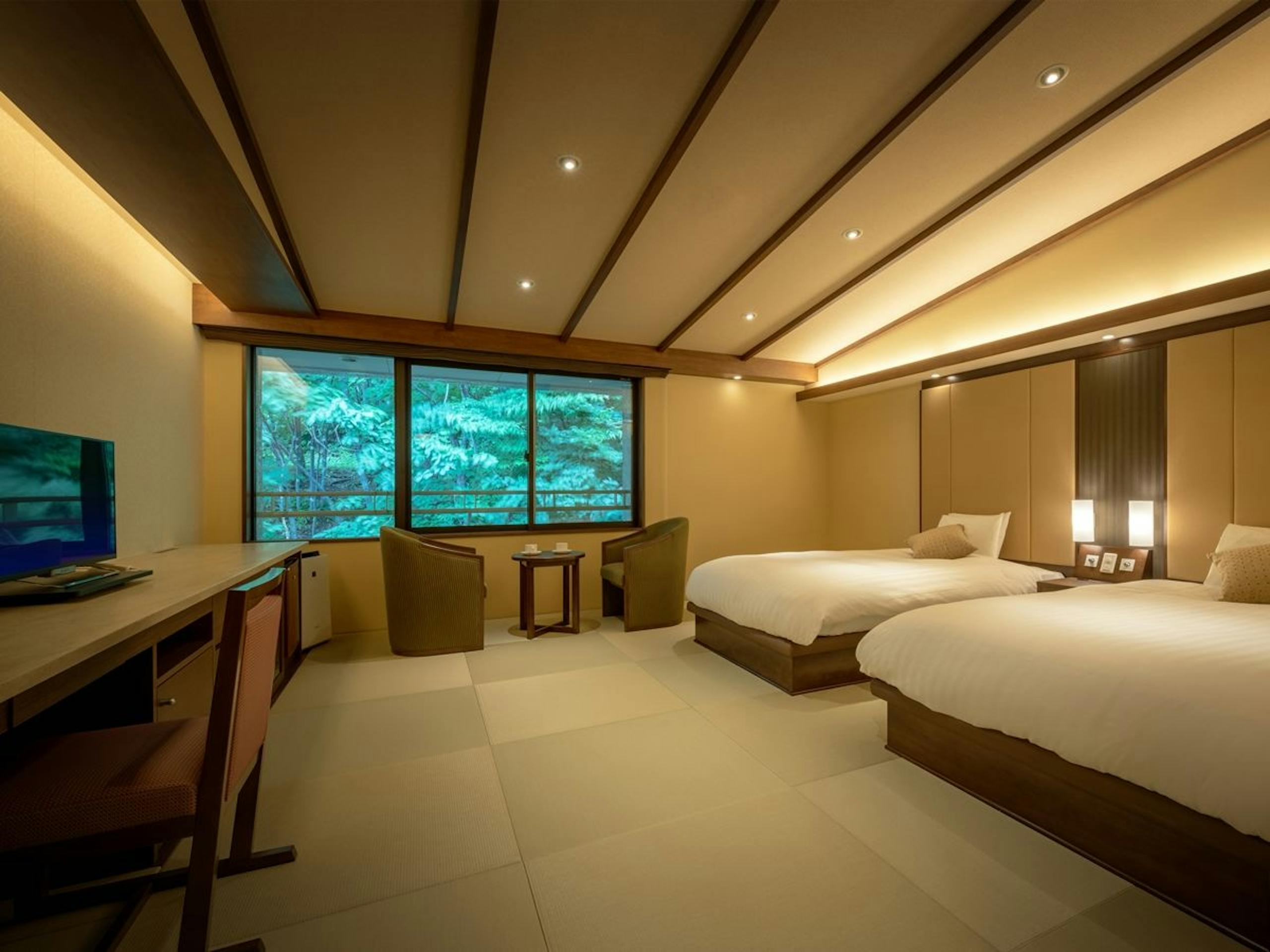 写真のお部屋はデラックスツインのお部屋。畳のぬくもりと、窓から見える緑に癒されます。